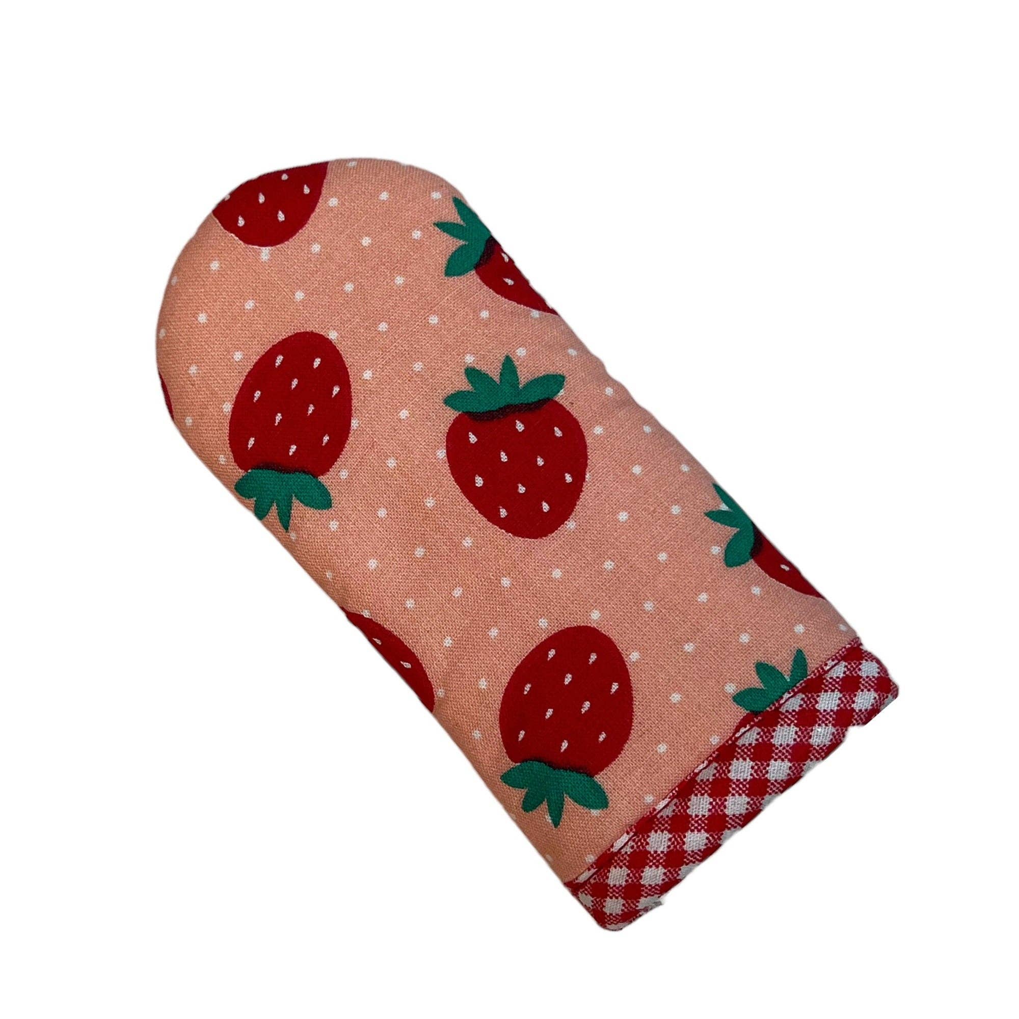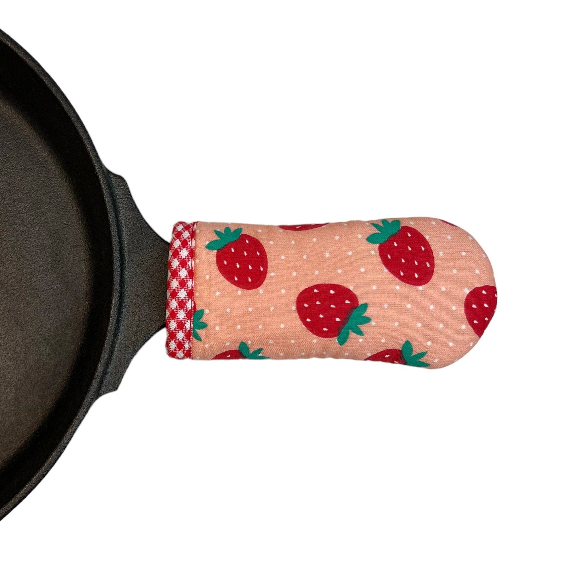 Our strawberry pattern is sweet and tasty, featuring red strawberries with white polka dots. The fabric background is pink, complemented by a deep green cotton lining and red gingham trim along the edge. Crafted with four layers of cotton batting, these skillet mitts provide excellent heat resistance. -You can leave it on the handle while cooking on low but please be cautious of a large open flame. -They are made of cotton and can burn if they come in contact with fire. Dimensions: -4 1/2" Long x 1 1/2” Wide. -Made to fit on small, medium and large cast iron skillets. Sold individually. Each order includes one skillet mitt. Please note that the placement of the pattern may vary. Care Instructions: -Machine wash in cold or warm water, then tumble dry low or lay flat to dry. -Avoid using high heat during washing or drying to prevent shrinkage. Safety Note: -While these mitts are heat-resistant, they are not fireproof, so use caution around open flames.