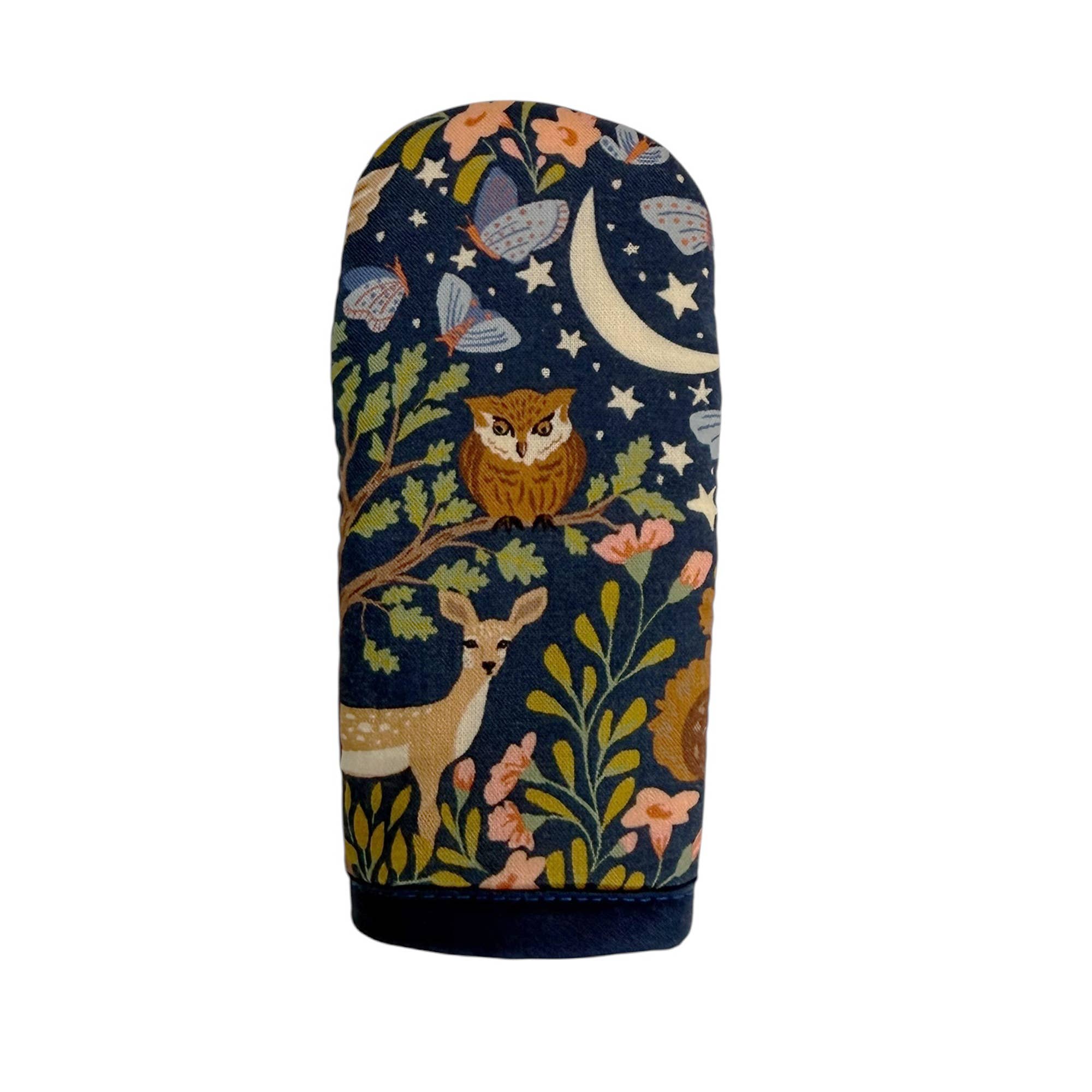 Forest animals are placed on a navy background with a navy blue lining and navy blue trim. Crafted with four layers of cotton batting, these skillet mitts provide excellent heat resistance. -You can leave it on the handle while cooking on low but please be cautious of a large open flame. -They are made of cotton and can burn if they come in contact with fire. Dimensions: -4 1/2" Long x 1 1/2” Wide. -Made to fit on small, medium and large cast iron skillets. Sold individually. Each order includes one skillet mitt. Please note that the placement of the pattern may vary. This fabric has a variety of forest animals so each mitt will be different. Care Instructions: -Machine wash in cold or warm water, then tumble dry low or lay flat to dry. -Avoid using high heat during washing or drying to prevent shrinkage. Safety Note: -While these mitts are heat-resistant, they are not fireproof, so use caution around open flames.