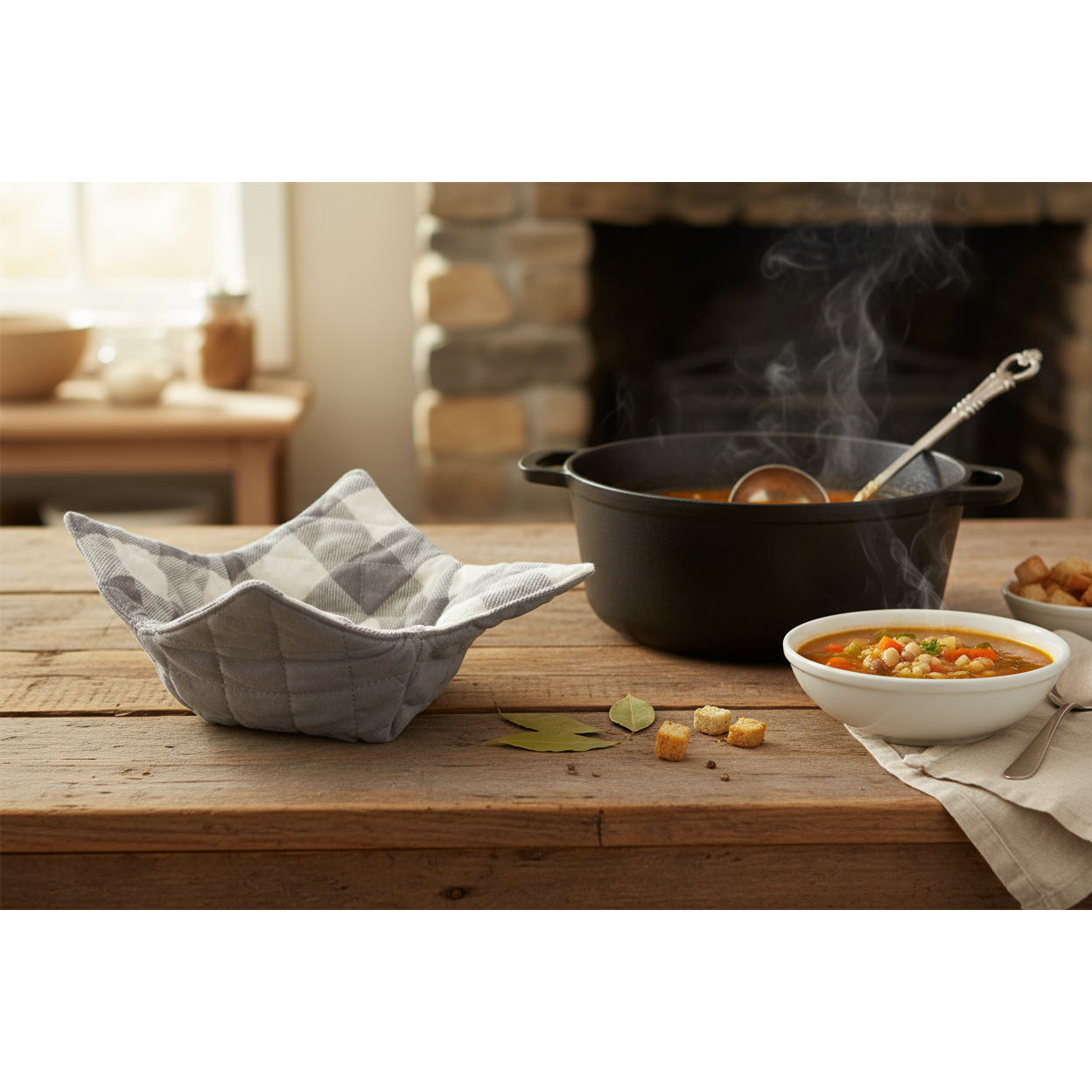 Tired of bowls that are too hot to handle out of the microwave? You need a bowl cozy! Place your bowl of soup in this microwave-safe bowl cozy, toss it in the microwave at 50% power and when it's done, pick it up using the cool-to-touch cozy instead of the hot bowl. It keeps your soup warm as well. It's reversible and machine-washable. Do not leave in microwave unattended. • SIZE: W9 x L9 x H2in • MATERIAL CONTENT: 100% Cotton, 100% Cotton Fill • CARE INSTRUCTIONS: Machine wash warm, lay flat to dry. Microwave safe. Do not leave in microwave unattended.