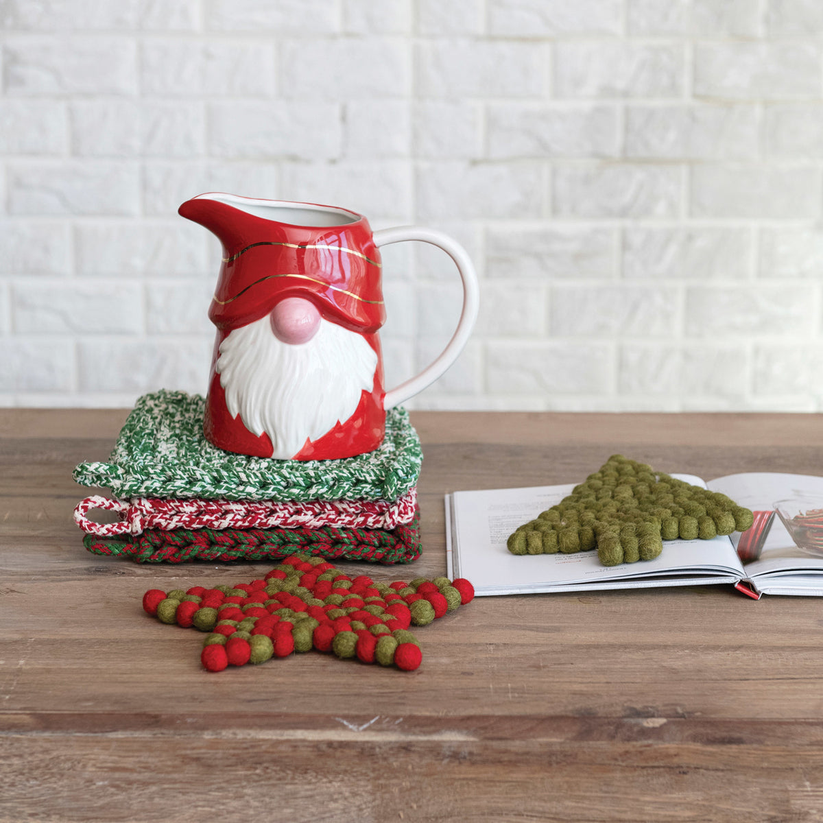 Hang decorative pot holders on the wall in the kitchen for added decor. They can even be placed right under the upper cabinets near the stove. They will look amazing and be readily accessible to grab when needed. Collect several styles of pot holders and layer them so each bottom one only shows an inch or two of its design or color. Three colors available: Red, Green, and Red/Green