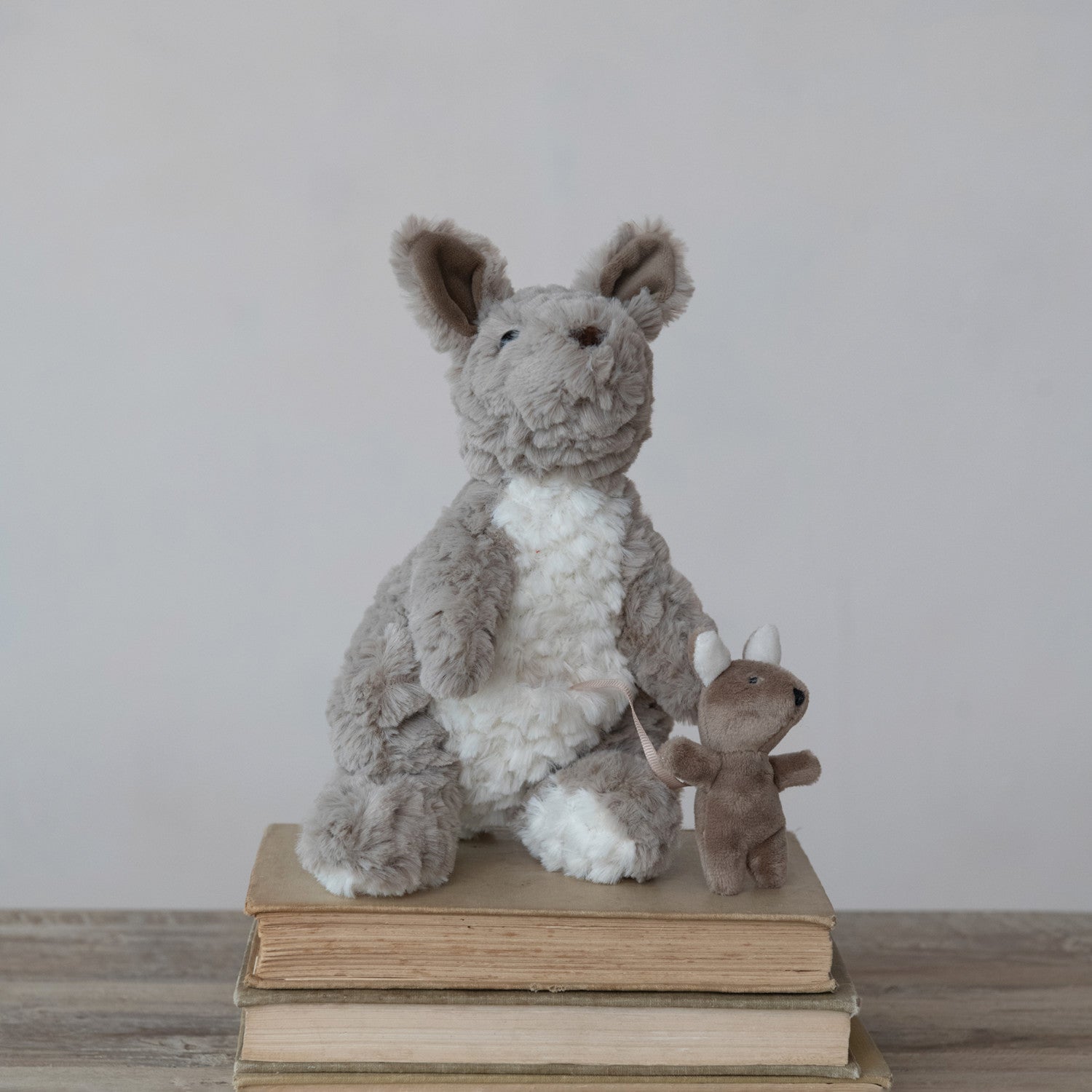 Hop into cuddle season with this adorable plush kangaroo duo! This soft, huggable friend features a gentle neutral color palette and comes complete with a tiny joey nestled snugly in its pouch—perfect for imaginative play or display. Ideal for little ones who love animals, this plush companion offers comfort and charm that'll have everyone reaching for it again and again. A delightful addition to any nursery or playroom! An adorable baby gift!