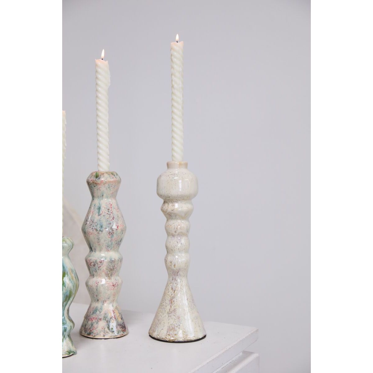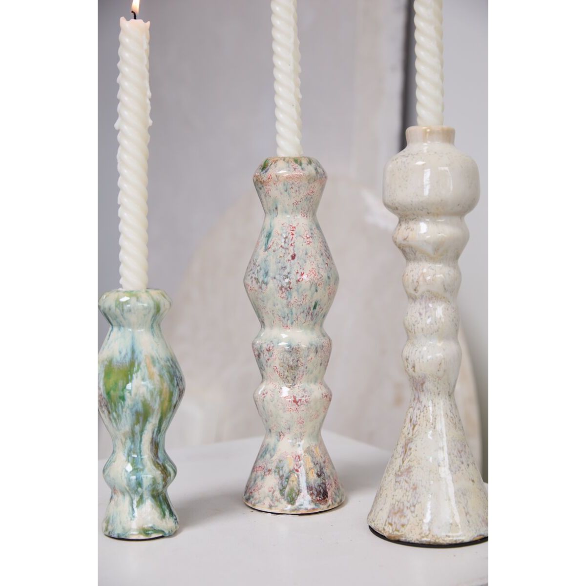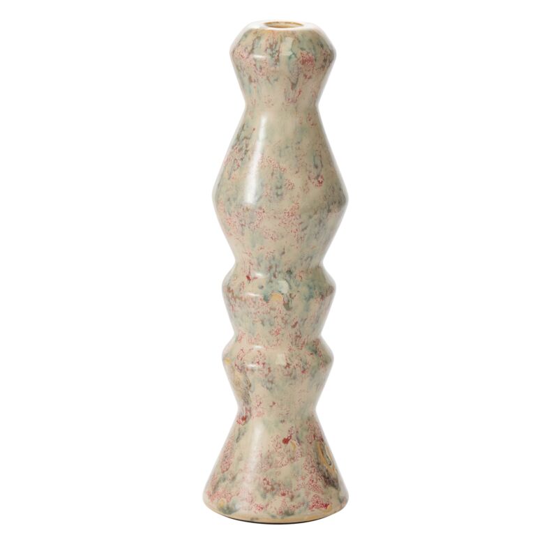 Drippy multicolored hues & organic curves are an ode to the handcrafted artisanal quality of the chunky ceramic Ailey Candleholder. Featuring an off-white base color & hand painted shades of green, red, & tan, each piece is unique in its color variation. Add a standard size taper candle & arrange alongside the other 2 Ailey styles as a trio on shelves or a dining table.