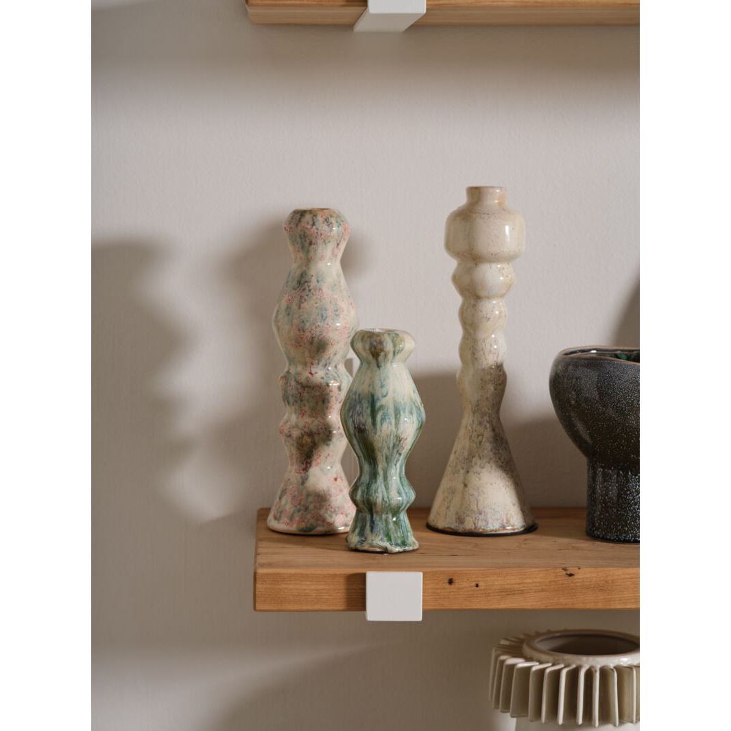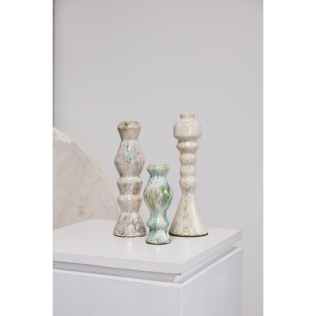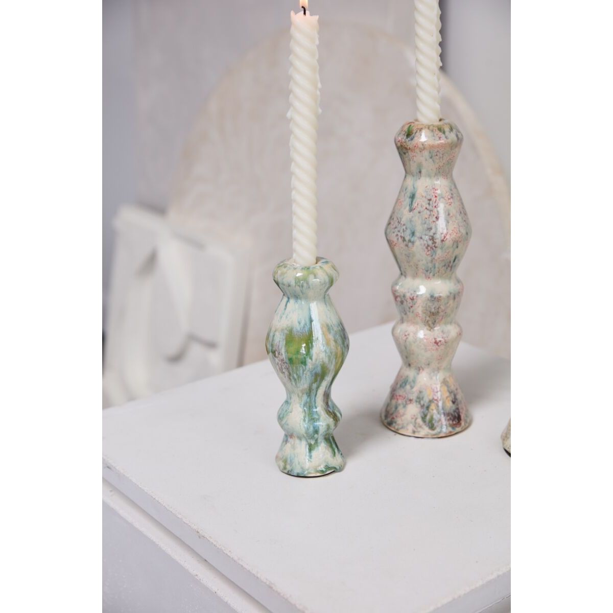Drippy multicolored hues & organic curves are an ode to the handcrafted artisanal quality of the chunky ceramic Ailey Candleholder. Featuring an off-white base color & hand painted shades of green, red, & tan, each piece is unique in its color variation. Add a standard size taper candle & arrange alongside the other 2 Ailey styles as a trio on shelves or a dining table.