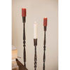 Three tall forged iron candle holders in antique brass make up this floor set. This trio was made in India and suits large entryways and empty corners. Split or group the set for a unique arrangement.
