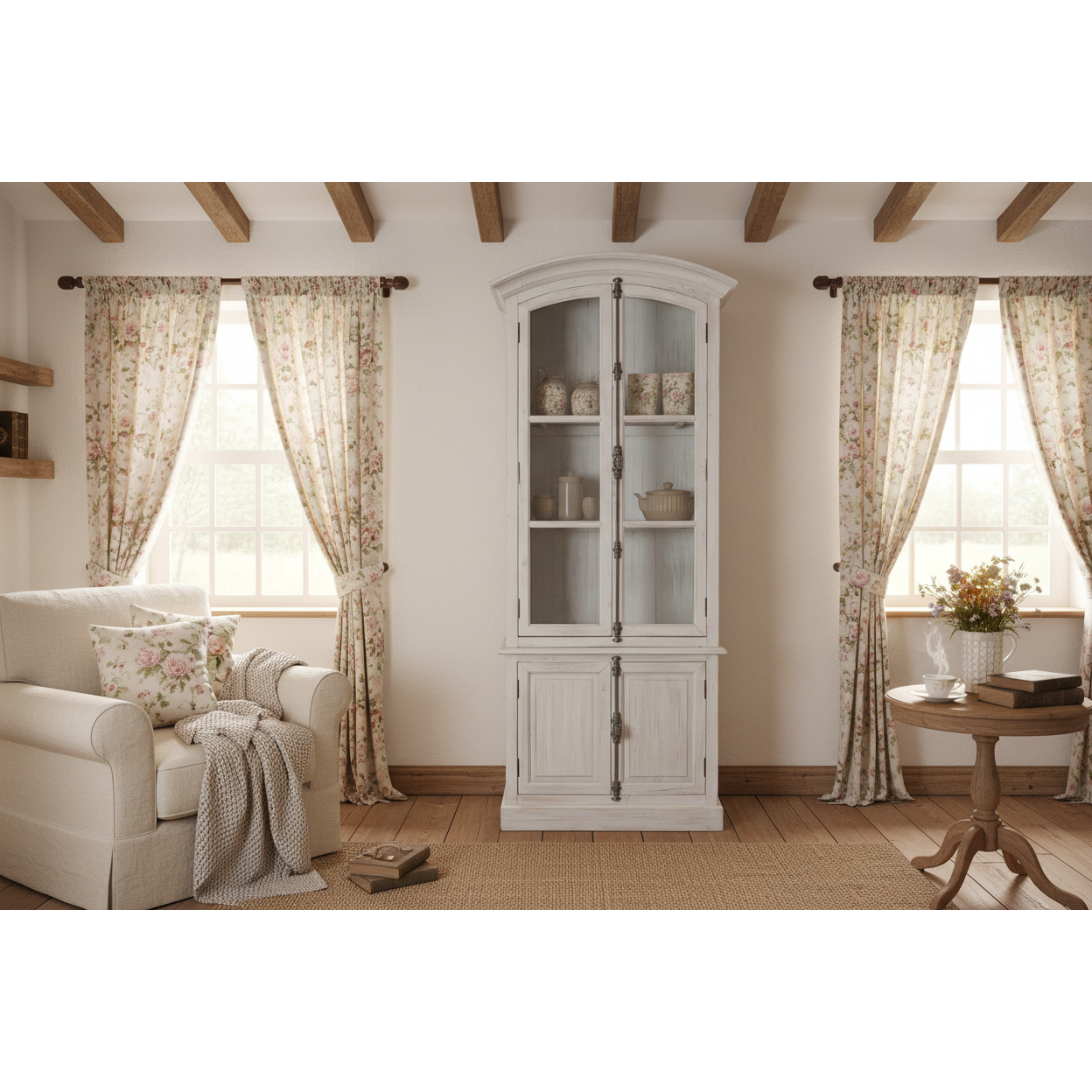 The Etienne Vitrine is two separate pieces made of reclaimed solid pine with a sand color hand-painted exterior and white interior. Fully functioning French style casement hardware on upper and lower doors in gray lightly distressed finish. Upper doors have glass and lower doors have wood panels.  Two non-adjustable shelves above and one below. Reclaimed pine will, by nature, likely have nail holes, cracks, knots and other imperfections.