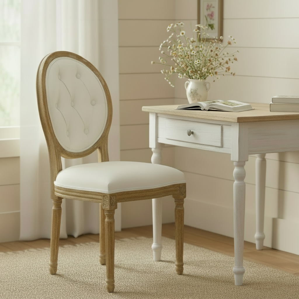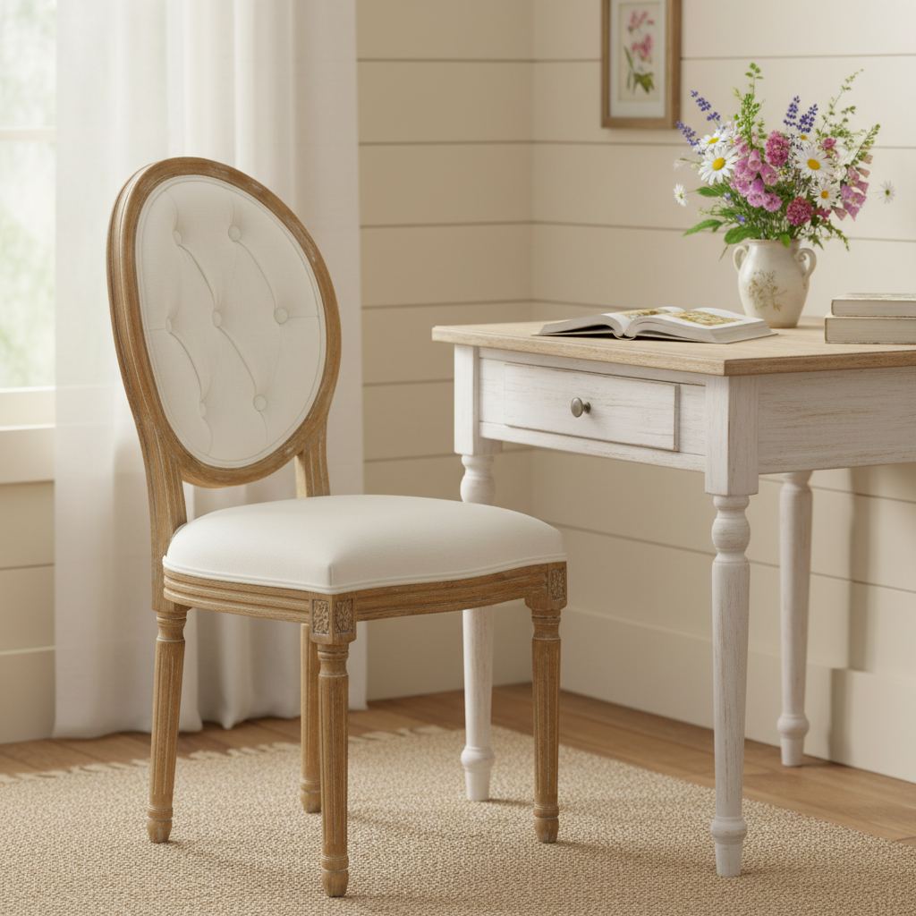The Meg side chair features a beautiful tufted back and carved legs, this chair is the perfect choice.