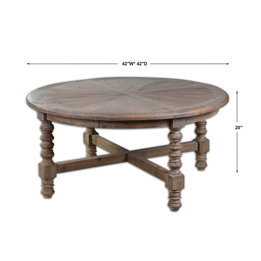 Built of 100% reclaimed fir, this table features hand-worked turnings and a sunburst top. Showcasing the natural beauty and time-worn character of salvaged wood, slightly different shading, distress marks, and graining will occur. Solid wood will continue to move with temperature and humidity changes, which can result in small cracks and uneven surfaces, adding to its authenticity and character.