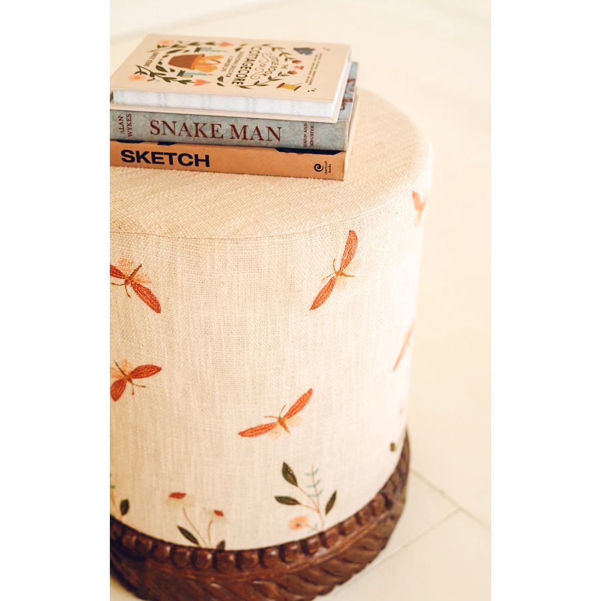 Try this upholstered ottoman with a carved wood base in cream and nature-inspired embroidered detail. Have a seat or use it for rotating tables in a small room. This light pattern suits all decor styles.