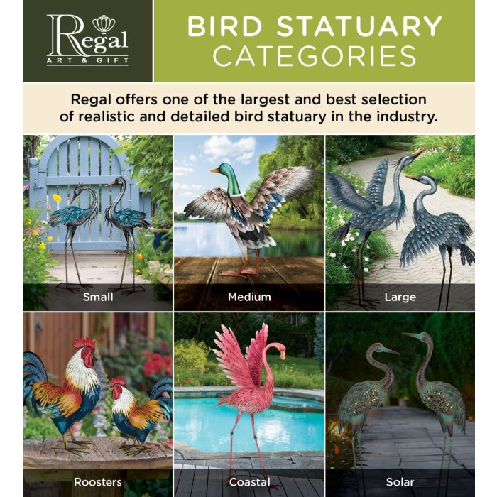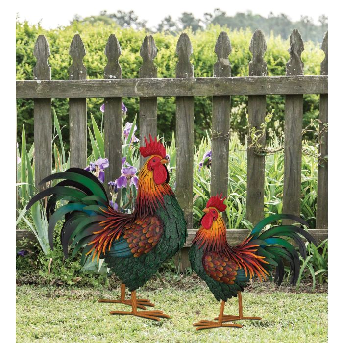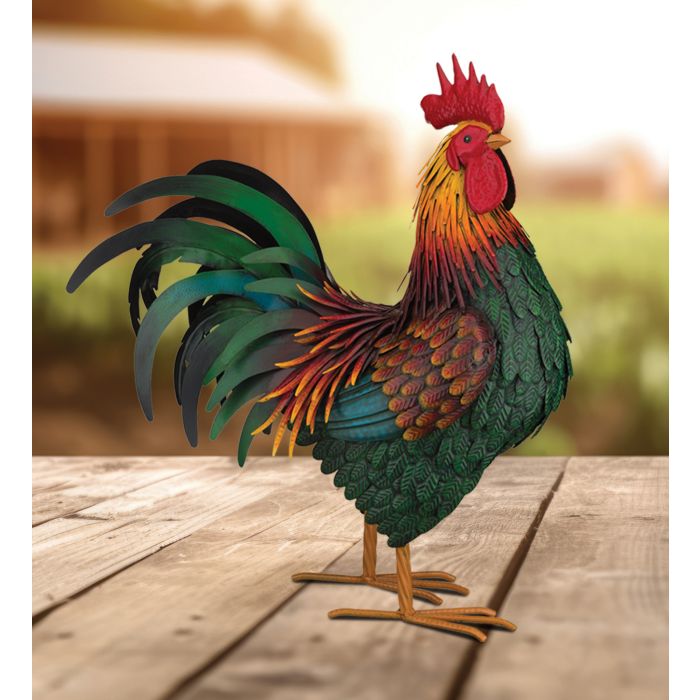 The beautiful Rhode Island Red Rooster is know for its rich brown, red and green feather colors. This rooster is crafted with true to life details, colors and size, and is made from durable metal meant for indoor or prolonged outdoor decorating.