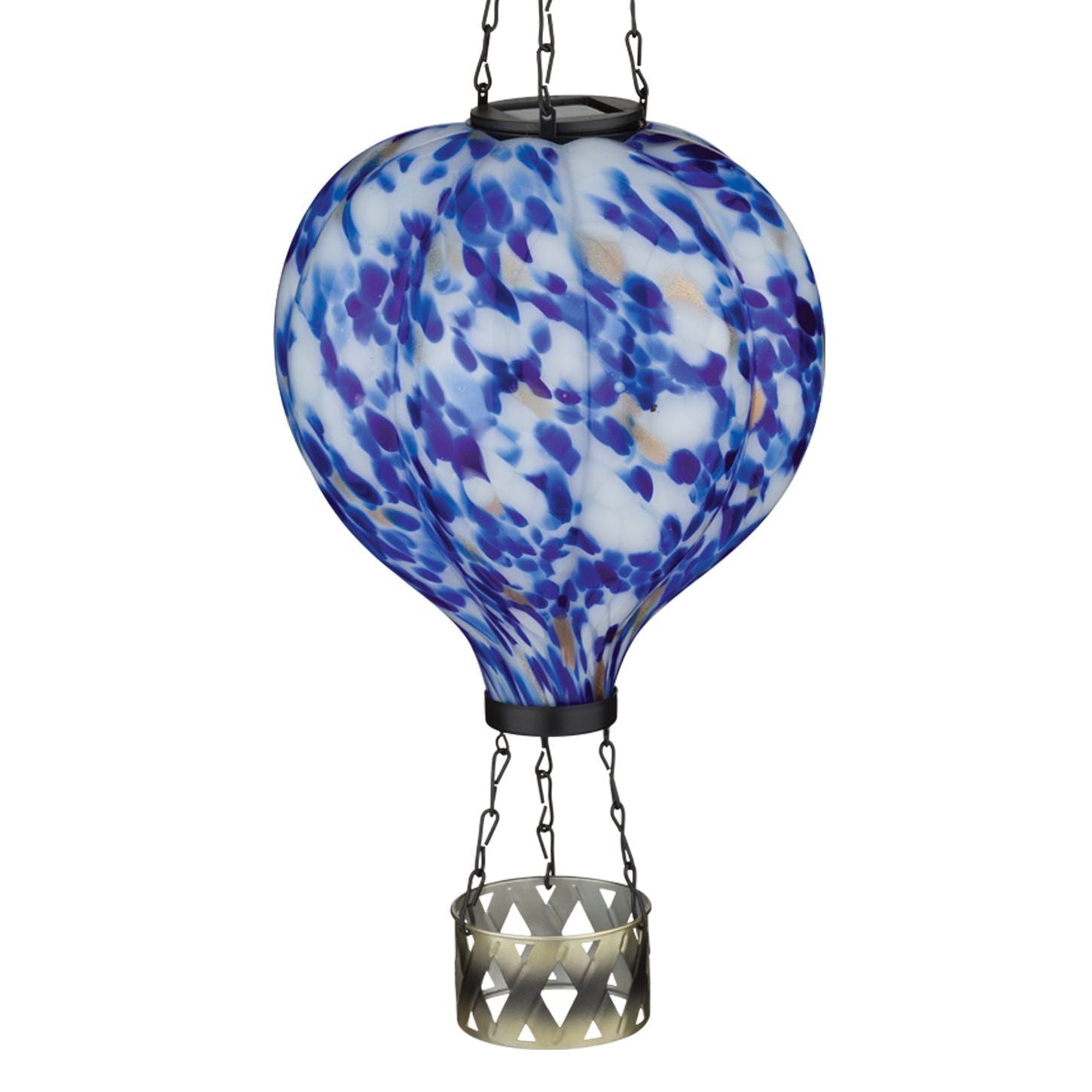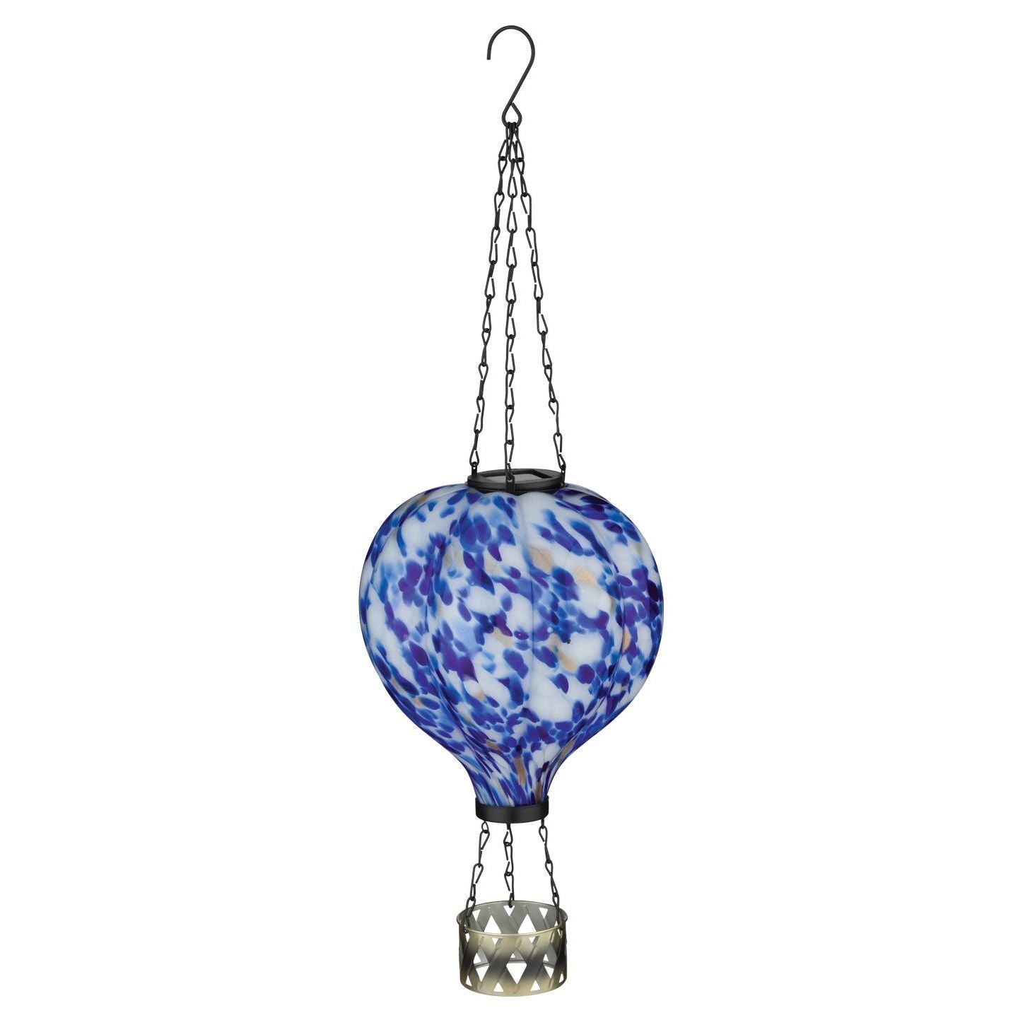 Hot Air Balloon shaped thick hand-blown glass lantern with colorful Murano styling. Solar-powered LED turns on at night, emitting flicker light mimicking the flame in a real Hot Air Balloon. Comes with a chain and hook for easy hanging. Hang from Regal's Shepherd's hook or a tree.