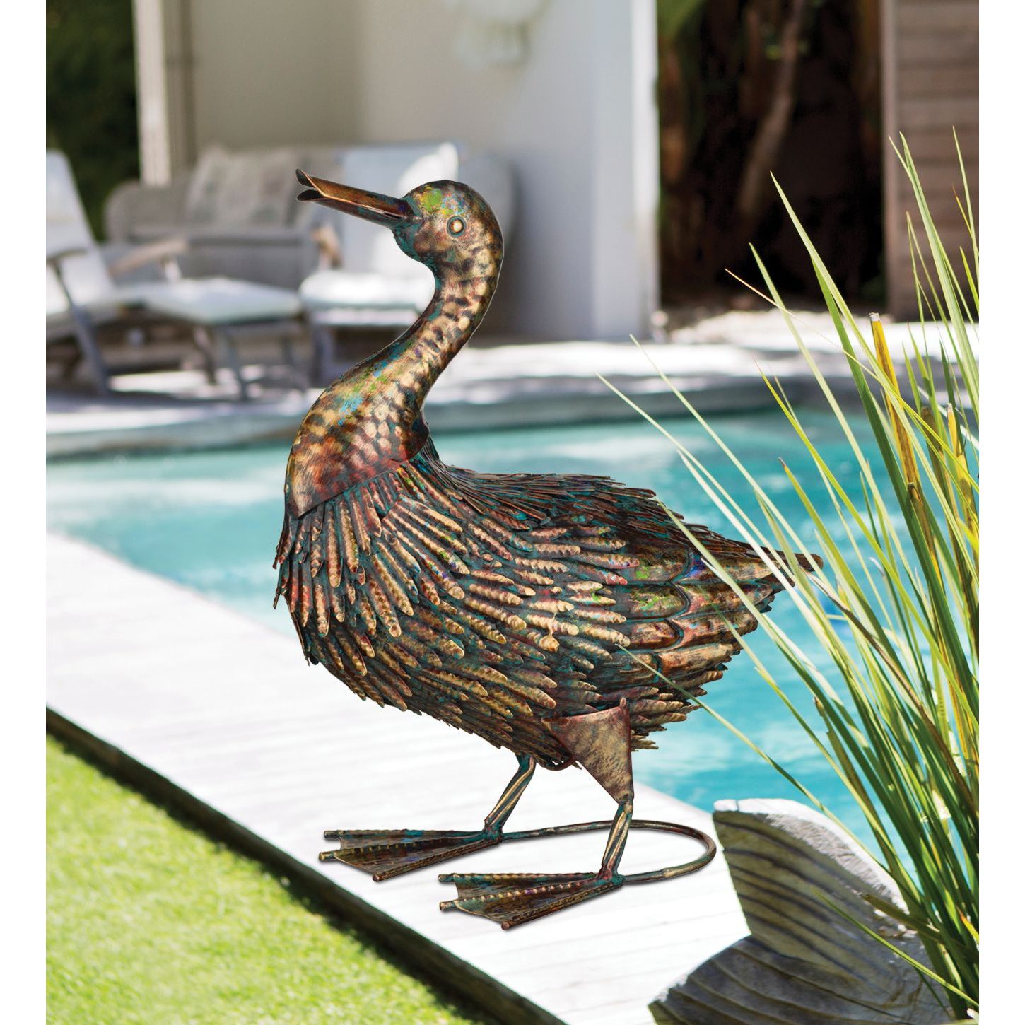 Beautiful Duck sculpture with a shimmering, iridescent surface that reflects a stunning range of colors, from deep blues and greens to vivid purples and golds. This unique finish creates a rainbow-like effect that glimmers in the light.