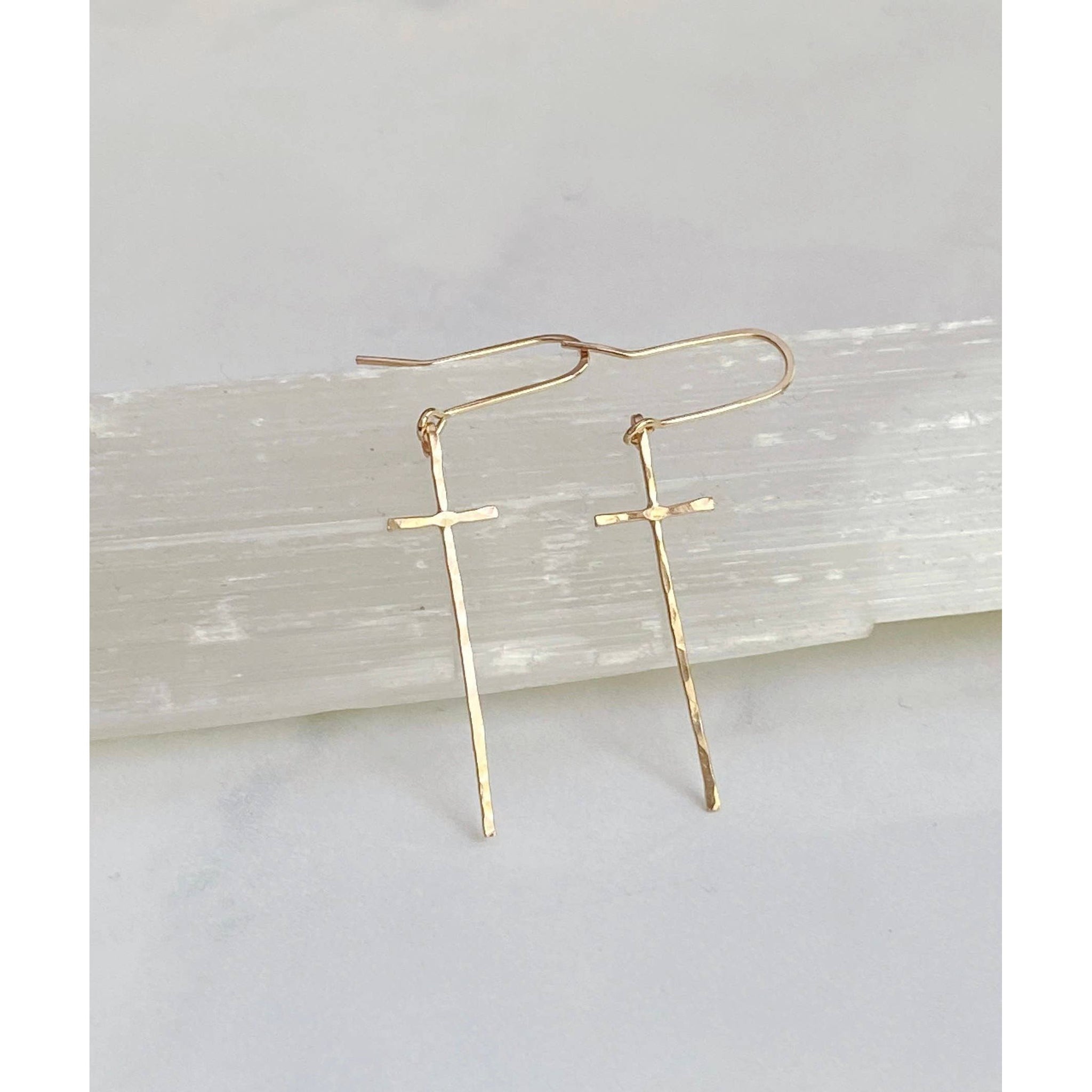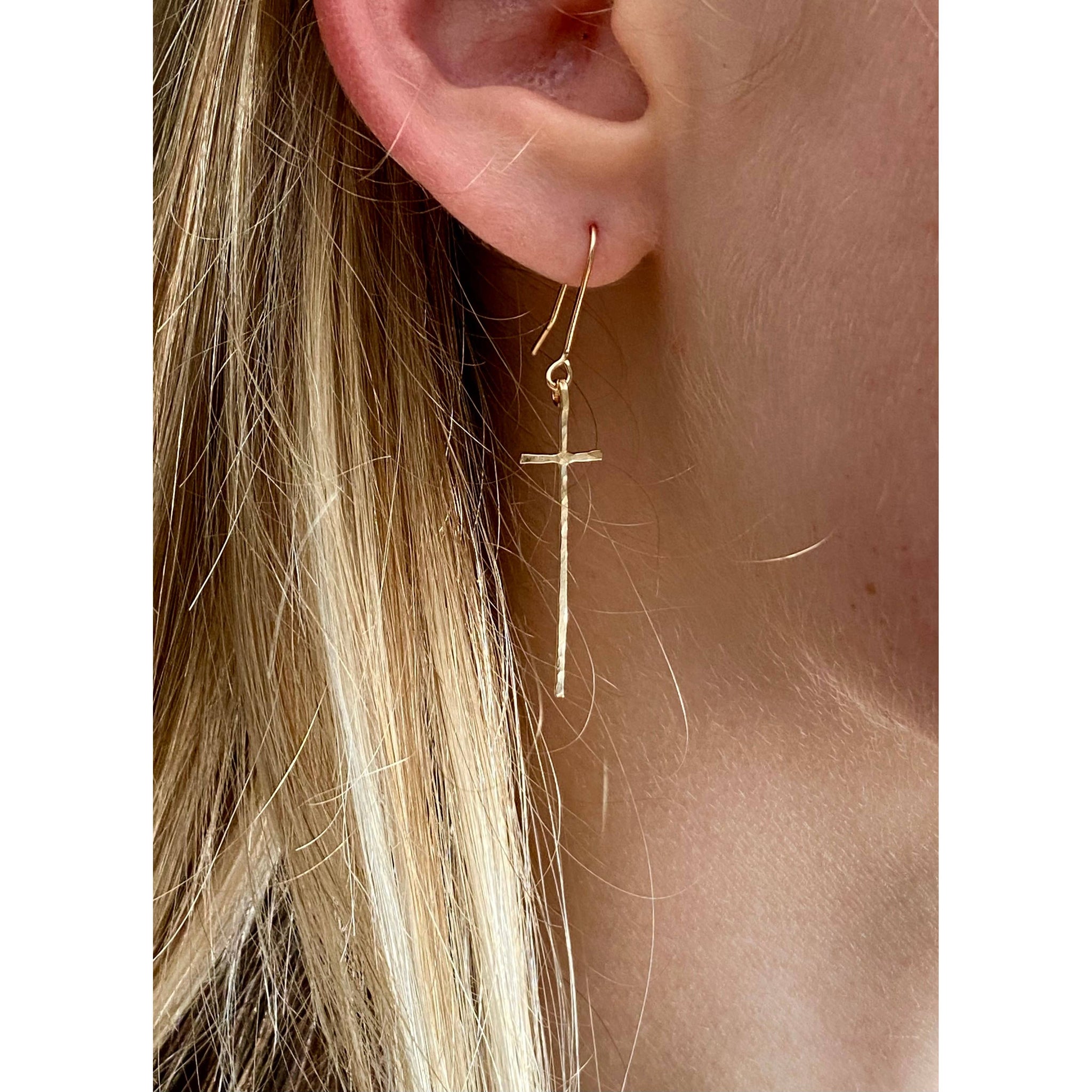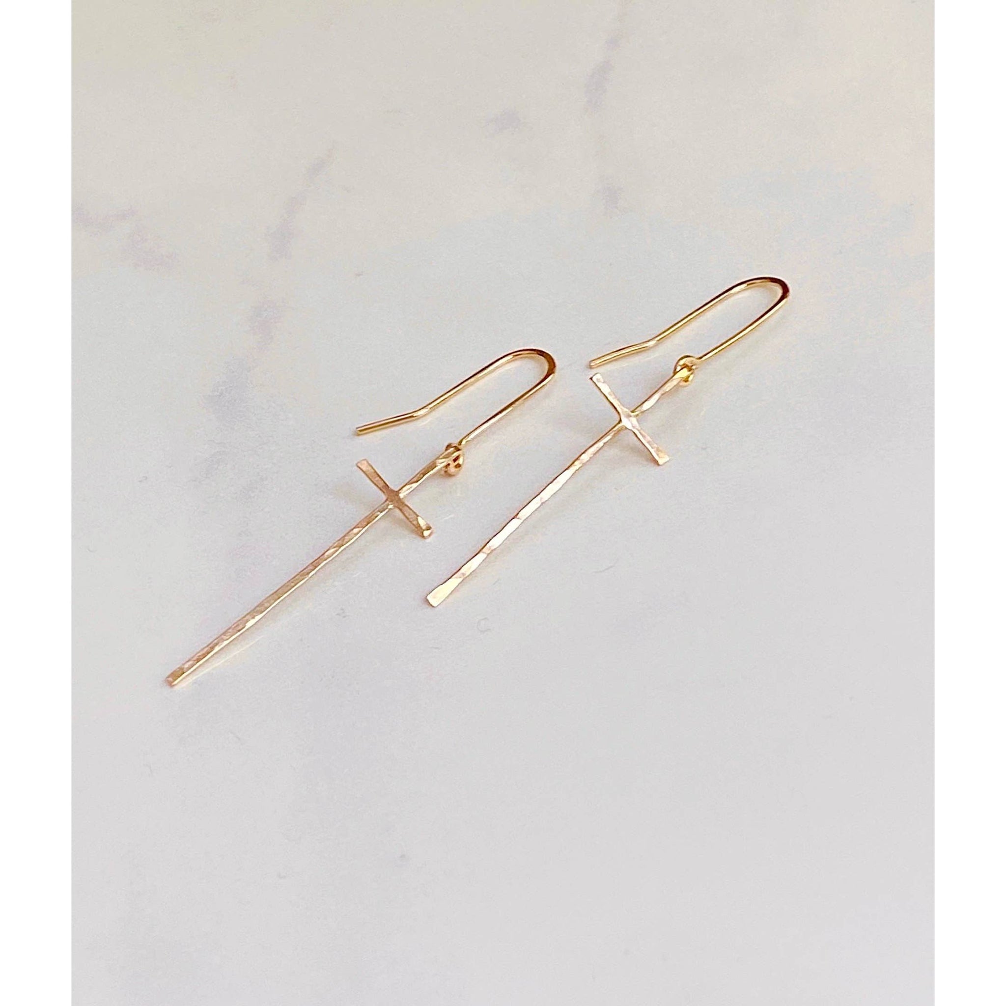 These simply beautiful minimalist earrings are so lightweight and have great movement. The cross is hand forged from 14kt gold filled or sterling silver wire and hammered with a dapple texture to catch the light. The french style wire is hand forged from 14kt gold filled or sterling silver wire. The cross from top to bottom is 1 1/4”