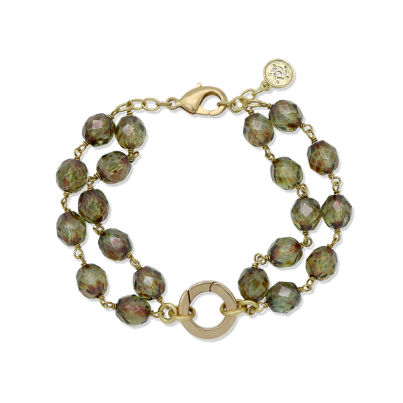 An ensemble is a cooperative of more than one that adds to the beauty and attraction of a piece.  In this vein, we've gathered the most gorgeous and eye catching faceted round polished glass beads in peridot green to create our Allure Ensemble Bracelet.  Hand crafted with a brass fastener; this one will absolutely fascinate. (Pair it with our Ensemble Necklace Allure for extra Wow.)