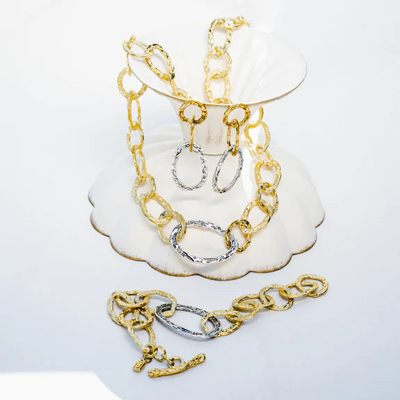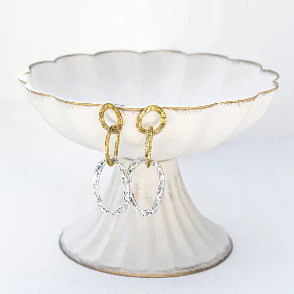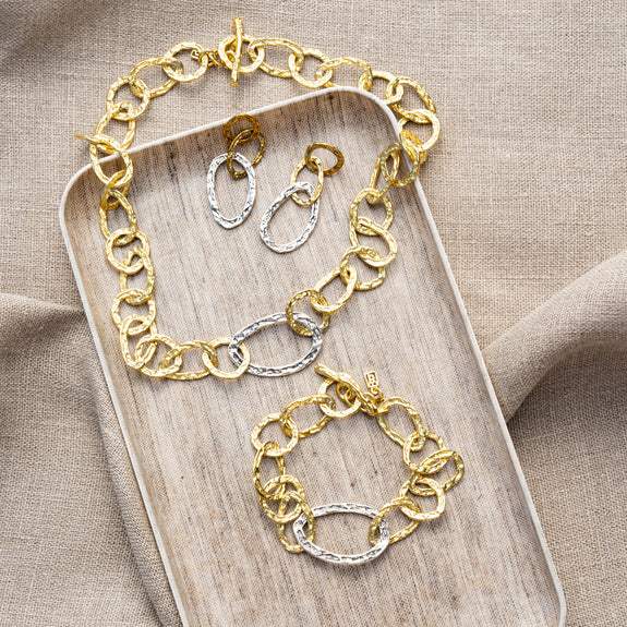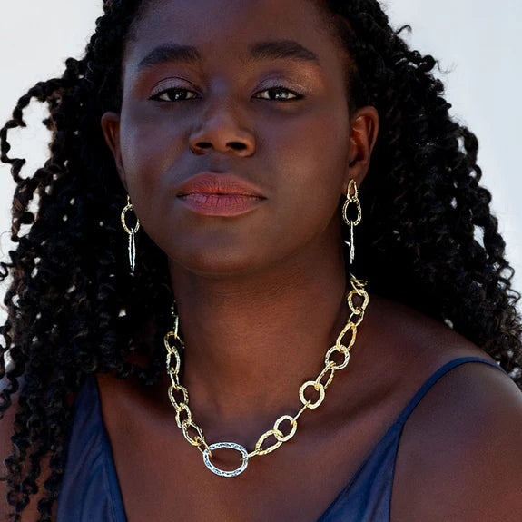 Be it an evening gala or a casual escape, our Rhapsody earrings are the go-to shape.  A mixed-metal melody of style, the remarkably light, hammered links are refrains of allure, handcrafted marvels to make your spirit soar. Capture the light that is yours with these treasures, and dance to life's melody, with wild poise and gleaming grace.