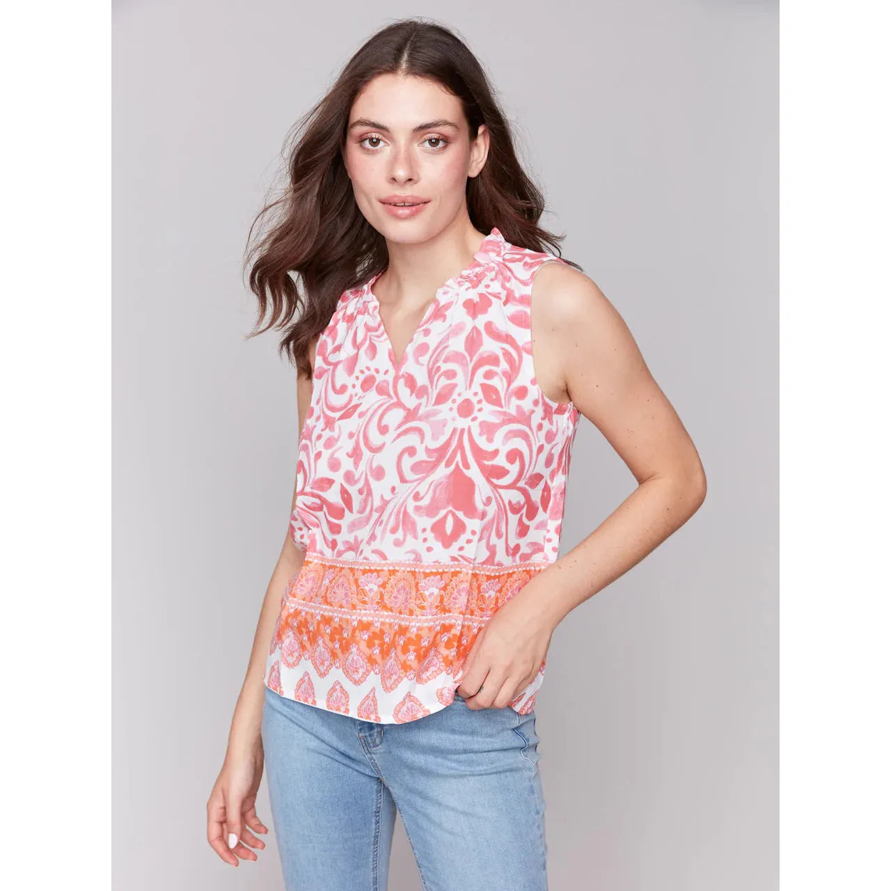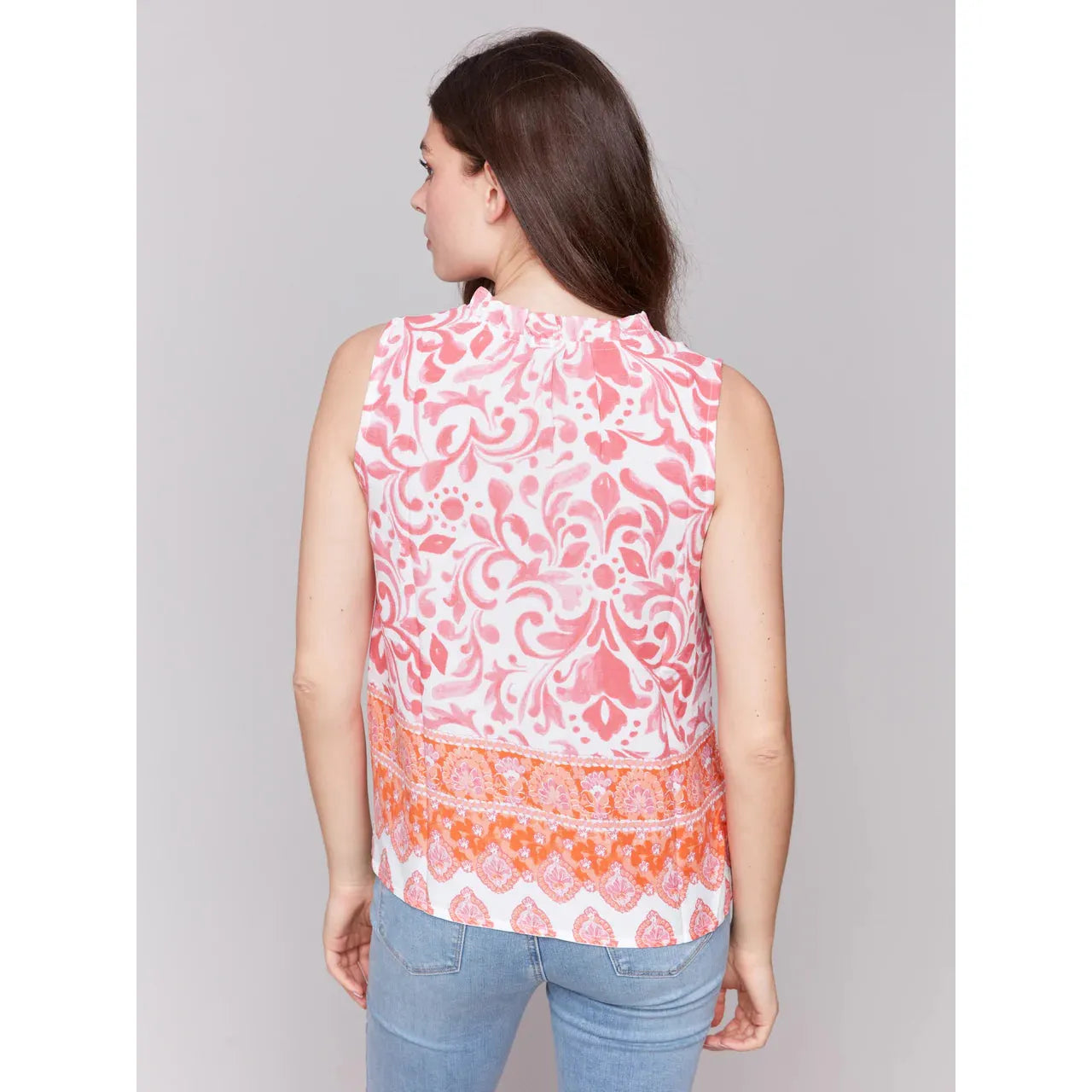Liven up your spring and summer wardrobe with this fun printed top! The sleeveless top showcases a detailed clementine orange and pink pattern that brings character and style to your outfit. Whether you're matching it with tailored pants for work or shorts for a weekend trip, this blouse is your must-have piece. The ruffle neck offers a delicate touch that's both fashionable and distinctive.
