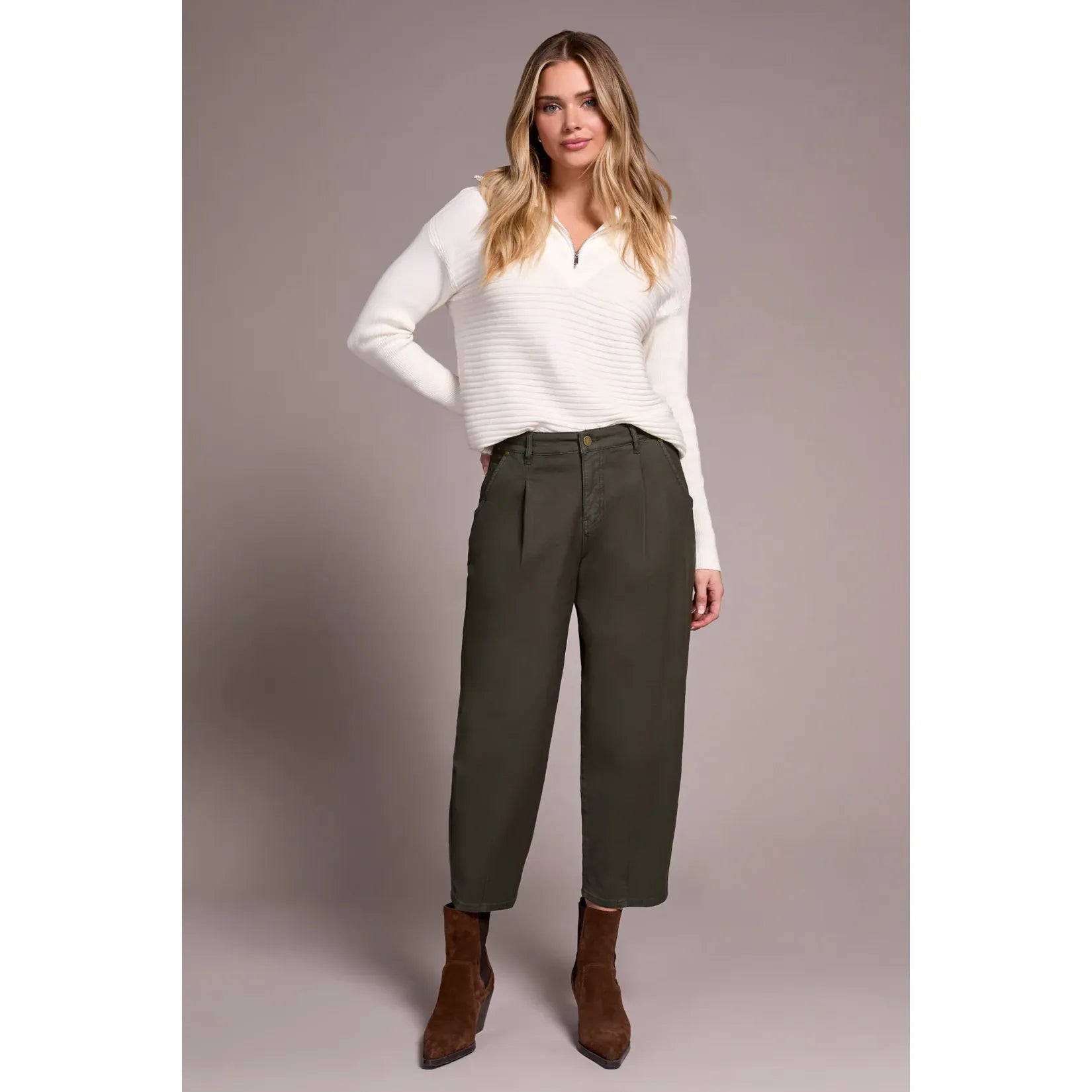 Embrace a relaxed style with these girlfriend jeans, featuring casual barrel legs in a refreshing cropped length. The front pleat detail and darts at the hem of the tapered legs add a touch of structured elegance to this laid-back look. Pockets offer convenient storage for your small essentials.