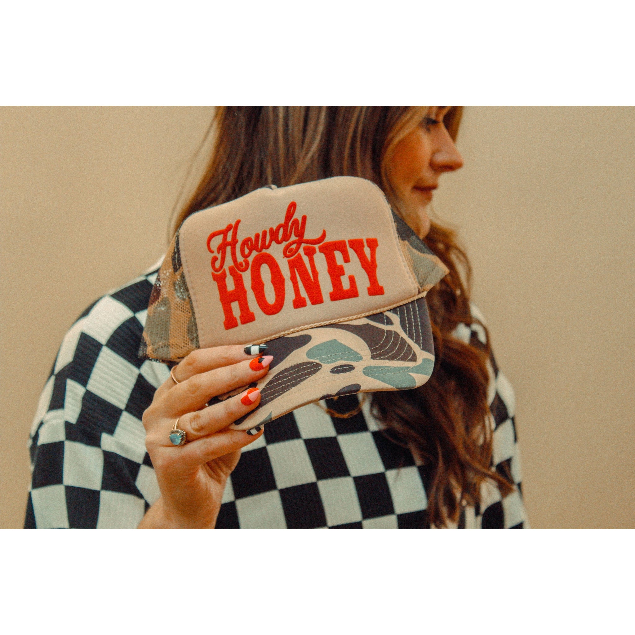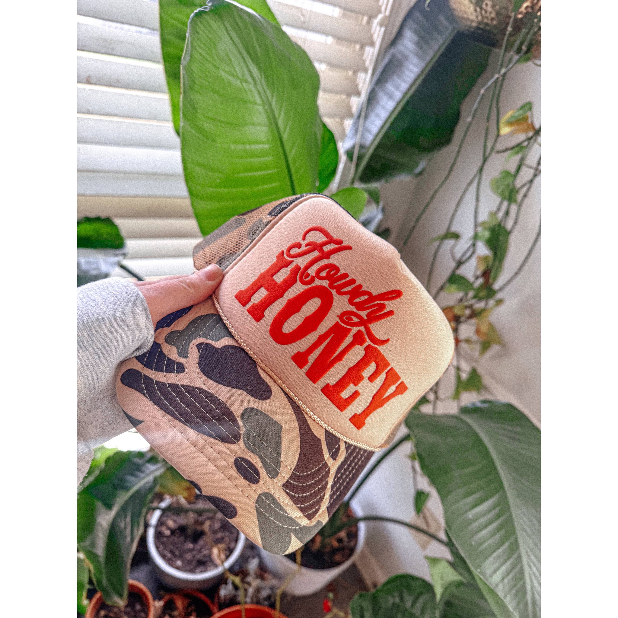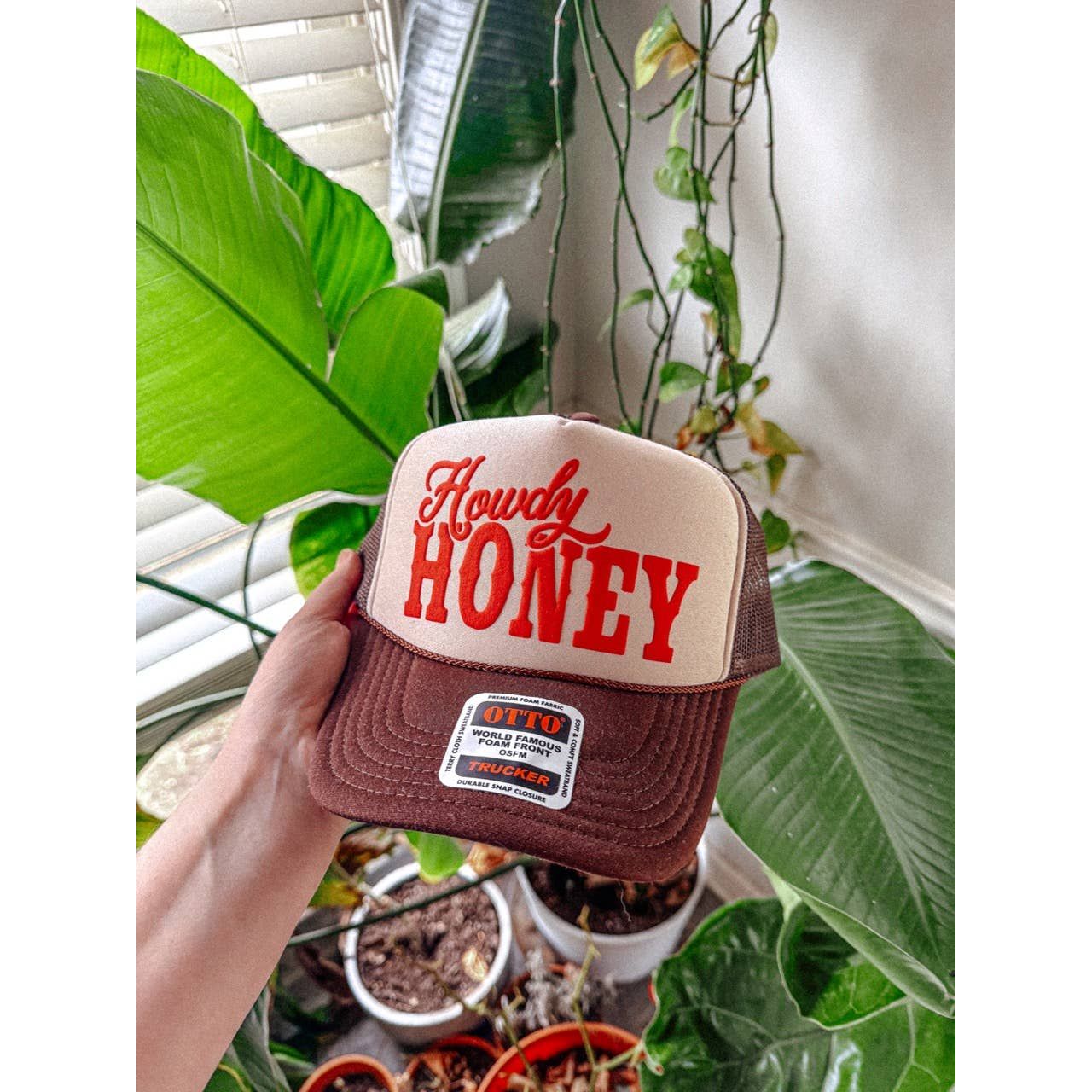 Show off your style in our Howdy Honey Country Western, puff trucker hat. - Features the phrase "Howdy Honey" across the front in a red puff ink - Come with a removable small pin attached to each hat - Individually heat pressed onto each hat - 5 Panel, Mesh Back with Snap Back *due to screens & filters colors may vary slightly to photos*