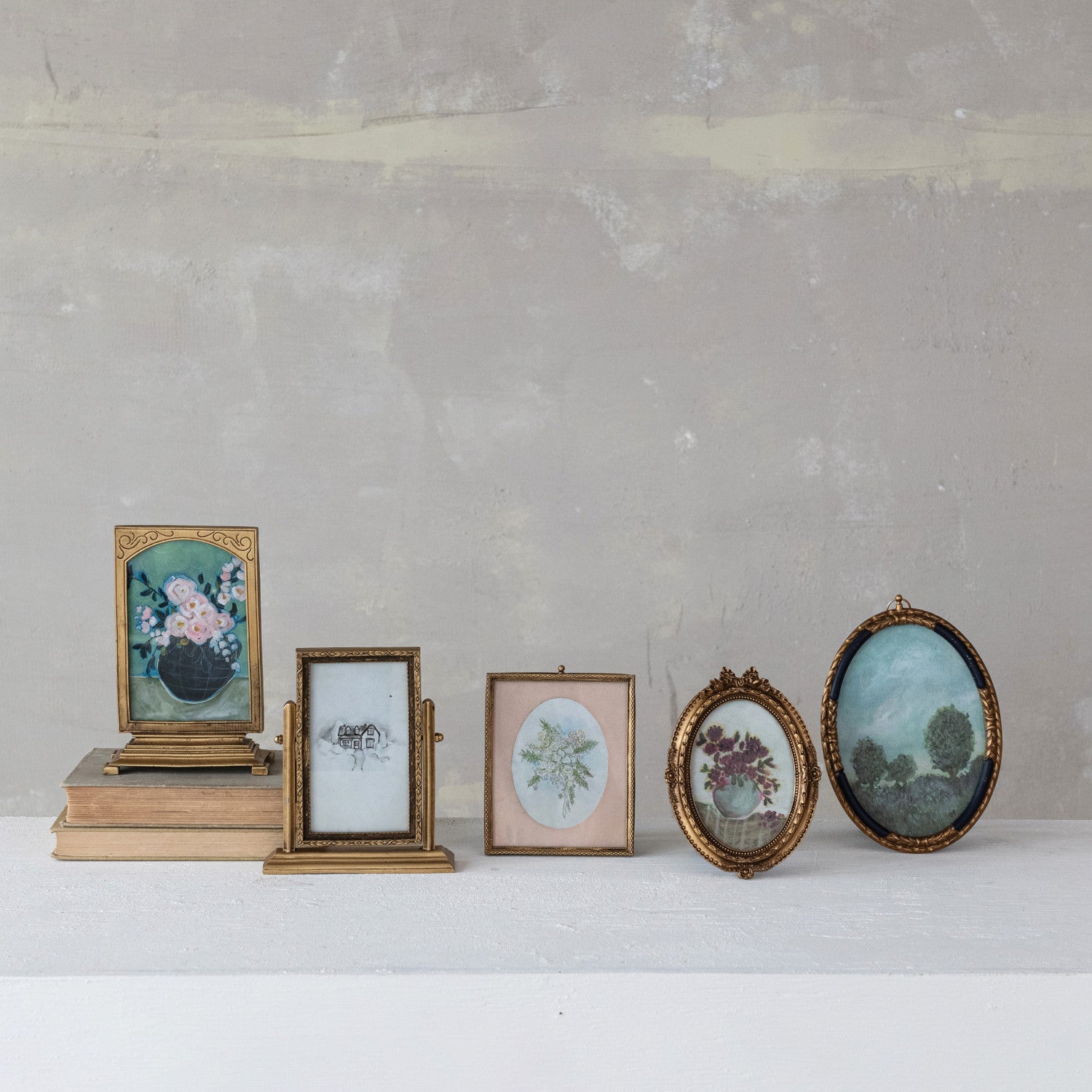 Pewter & Glass Photo Frames w/ Art, Brass Finish & Multi Color