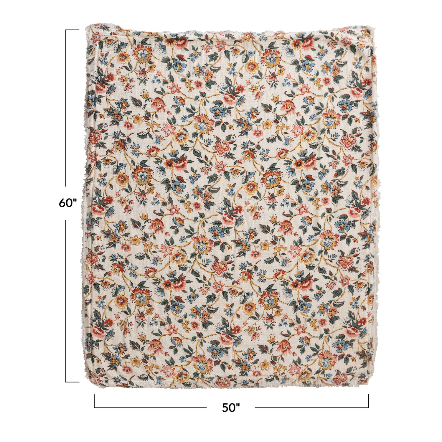 Woven Cotton Printed Throw w/ Sherpa Back, Flower Pattern & Fringe, Multi Color