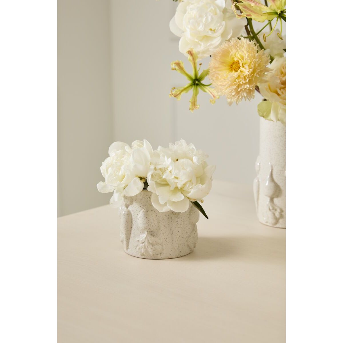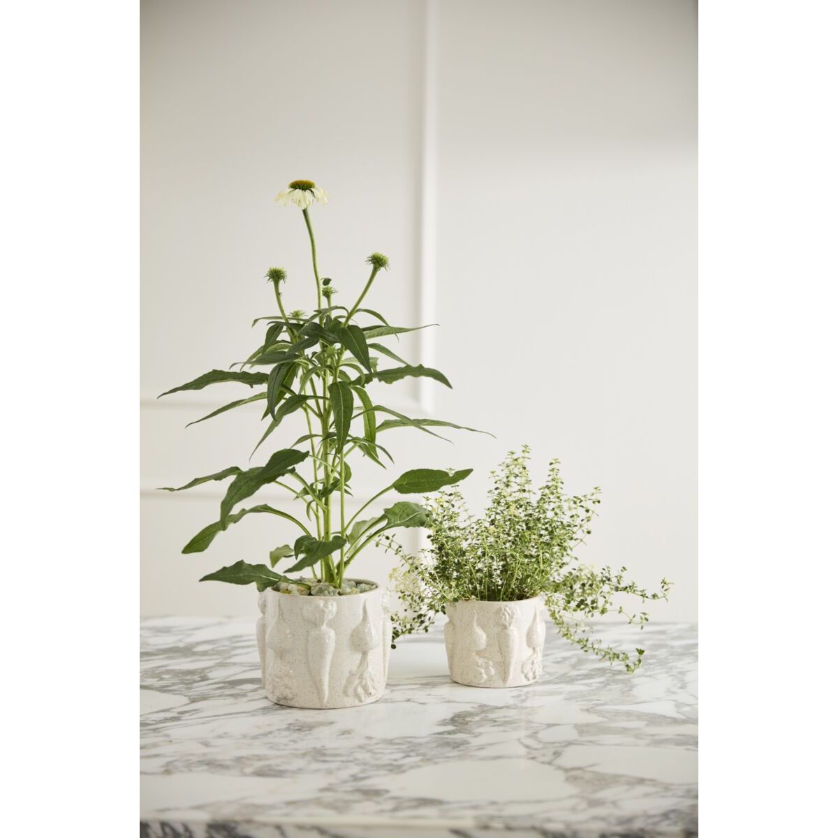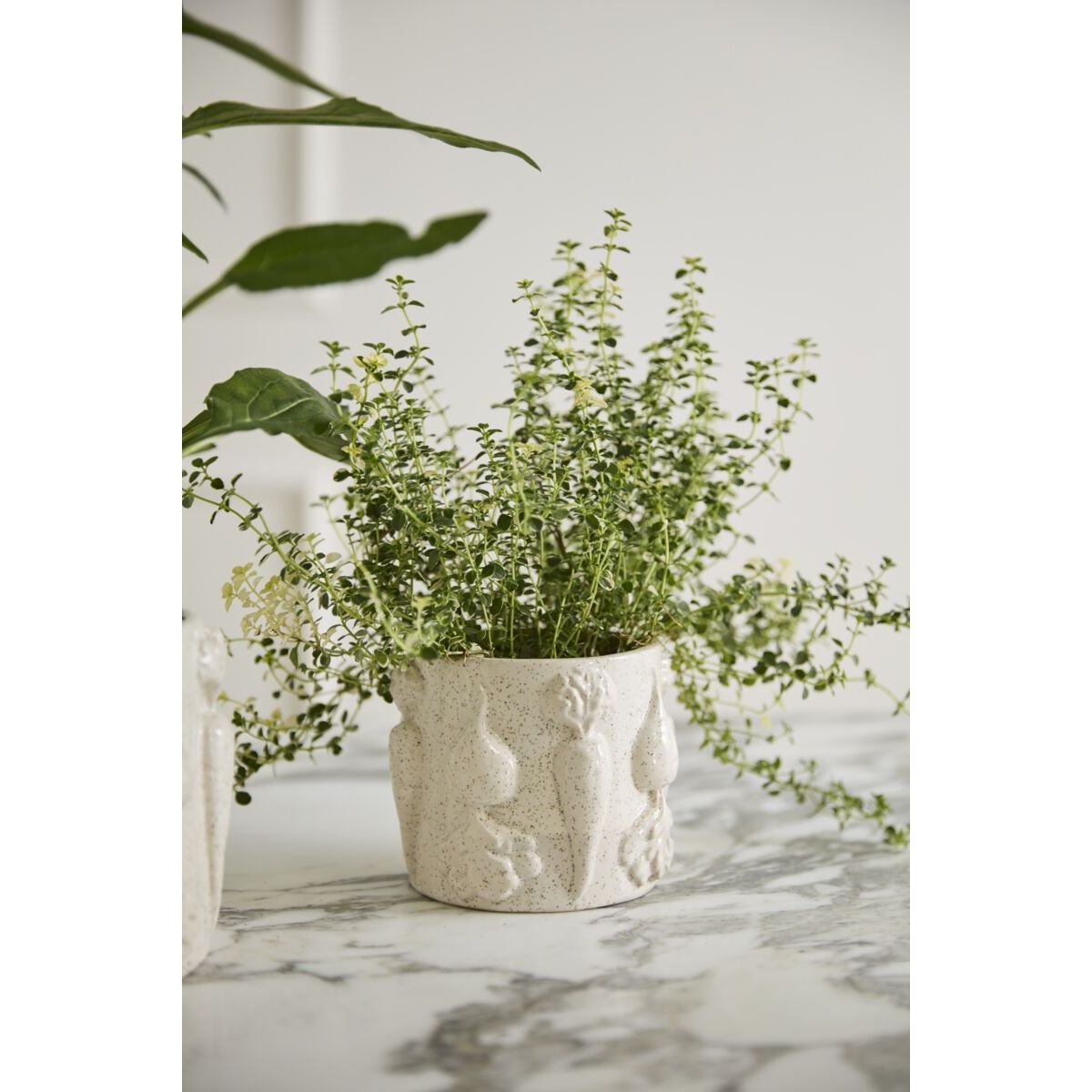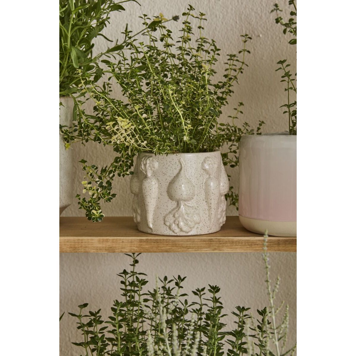 With subtle garden flair adorning the exterior, the glossy, neutral ceramic Veggie Pot offers an ode to spring & new growth as well as a watertight home for plants. Featuring detailed dimensional root veggies & an off-white slightly speckled finish, this pot is a perfect Easter accent with a bright springtime floral arrangement or a 3.5-inch drop-in plant.