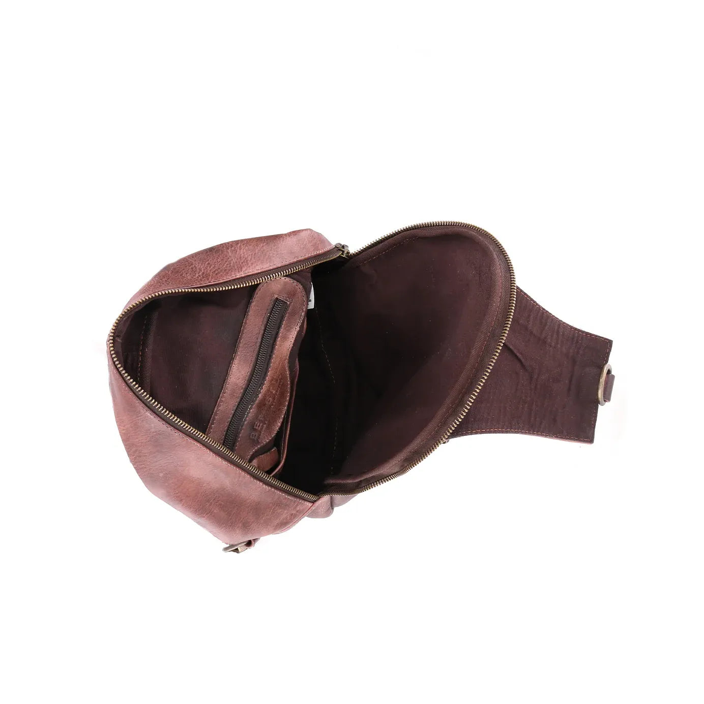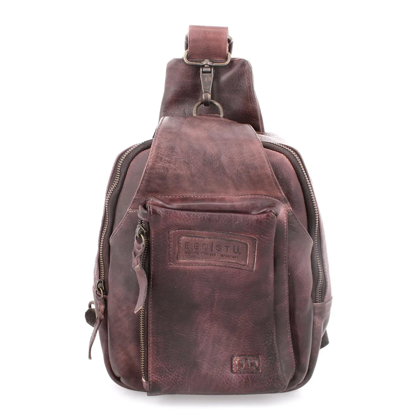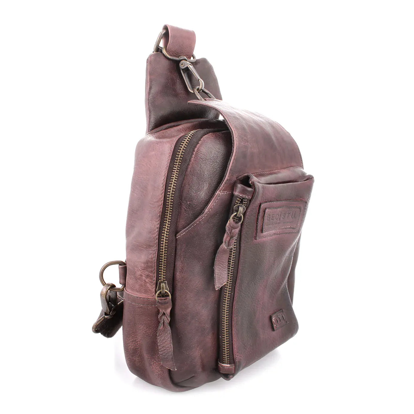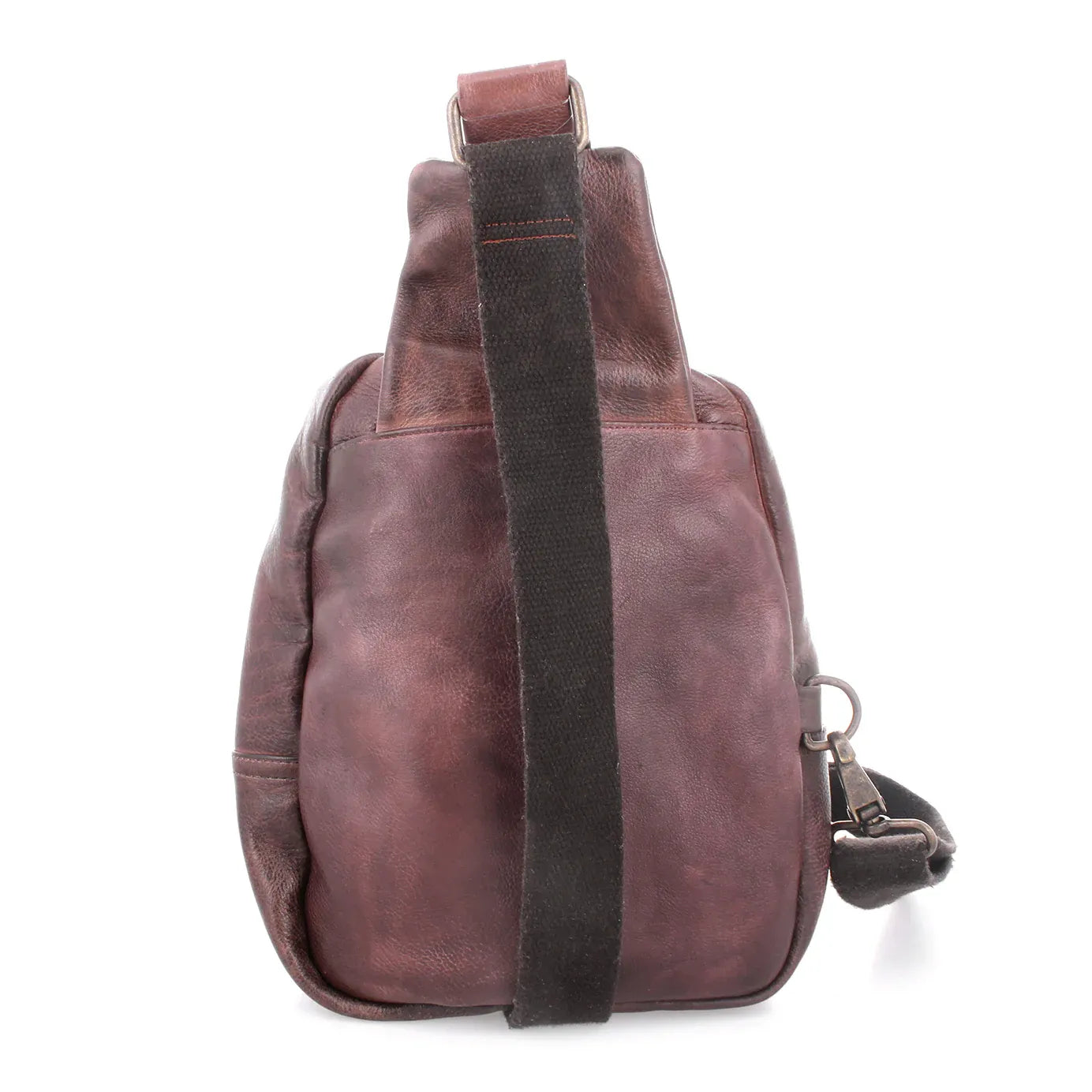 • One arm, sling leather backpack with adjustable fabric strap
