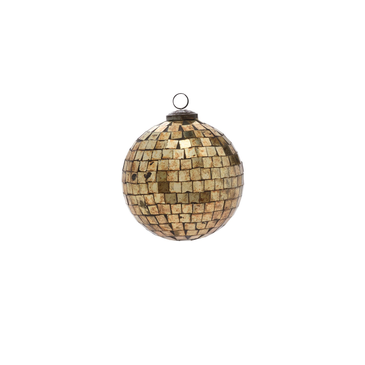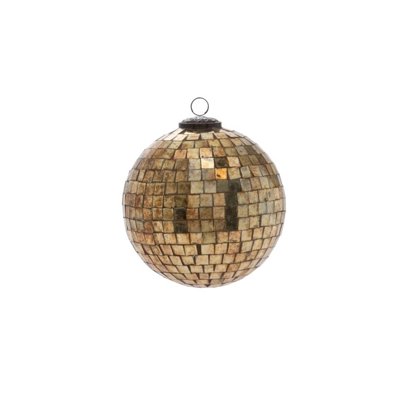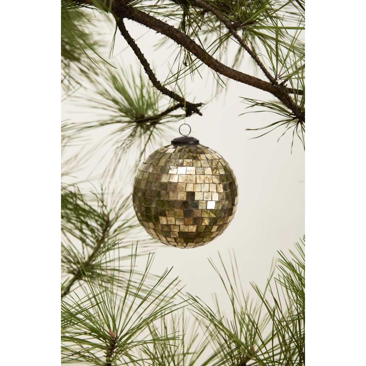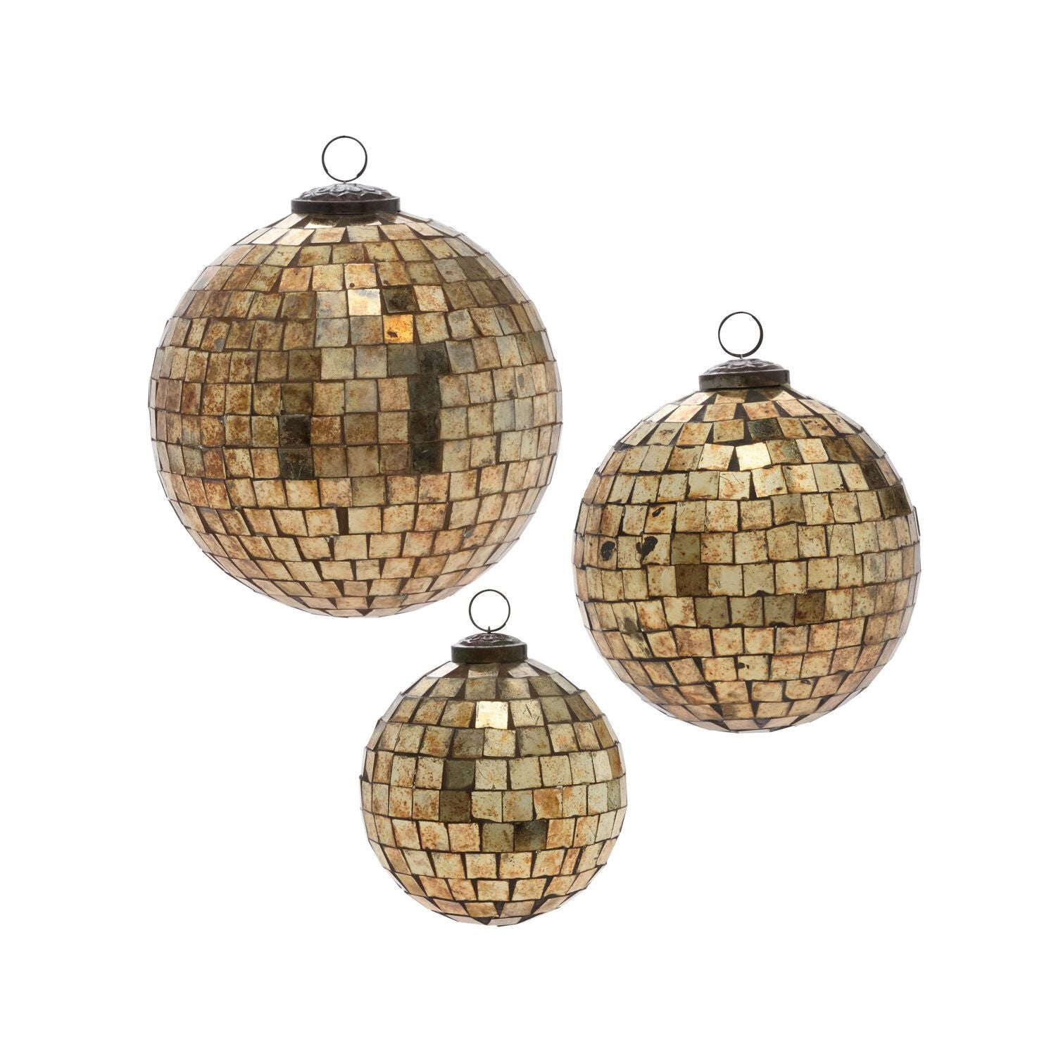 Add a warm glow to a holiday display or Christmas tree with the Antiqued Disco Ball Ornament Collection. Available in three sizes, these tiled glass spheres have a mercury finish and a dark brass metal cap. Capture all the fun of the disco ball trend, but with a vintage vibe! On a tree or piled into a vessel as a decorative bowl filler, this collection will stand out as a seasonal favorite.