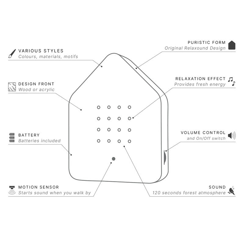 Use sound as interior: Original Relaxound Boxes offer you soothing nature sounds, such as birdsongs, jungle sounds or ocean waves – activated by a motion sensor and as clear as if you were live in nature. Their exclusive design provides a stylish accent, whether placed in the bathroom, hallway, living room or any other space.