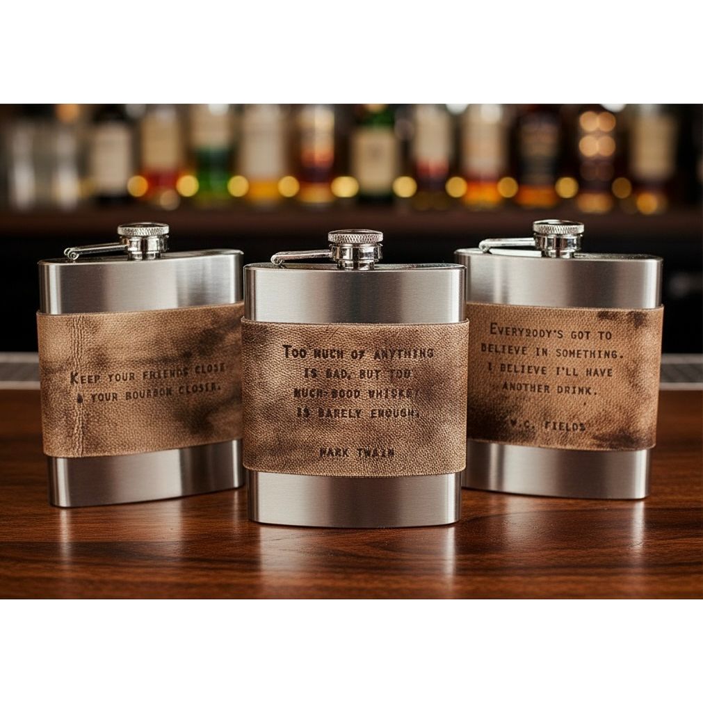 These leather flasks make for the perfect gift. Each flask is made of stainless steel with a leather wrap embossed with a quote. Due to the distressing of the design, verbiage may be difficult to read in some cases and is not considered flawed.