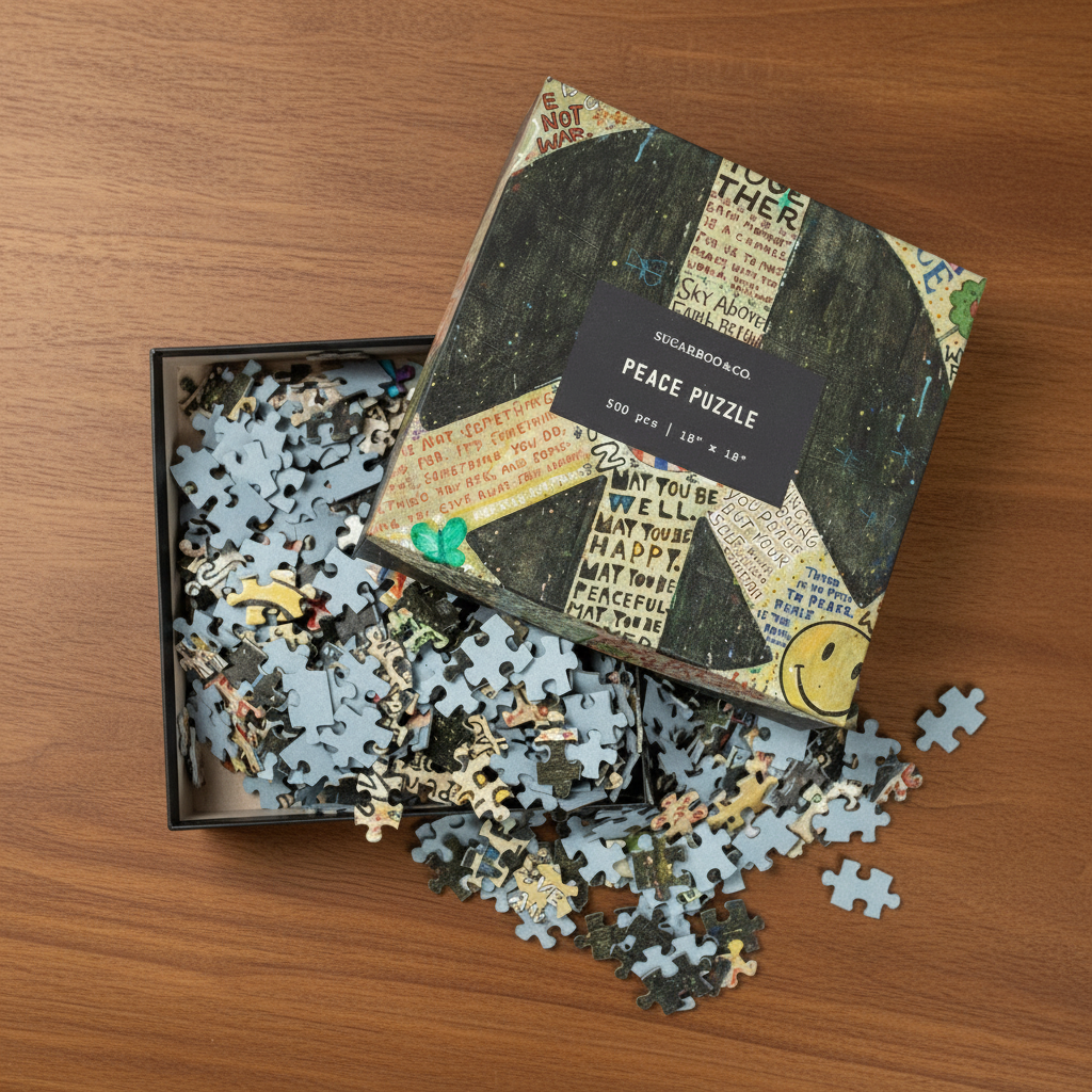 This big Peace Sign puzzle is a reminder to keep the peace when the world feels a little wild. With words of "Teach Peace" and "Come Together", this 500 piece puzzle is inspired by our current art print and will be sure to remind you that coming together and sharing peace is the medicine we all need.