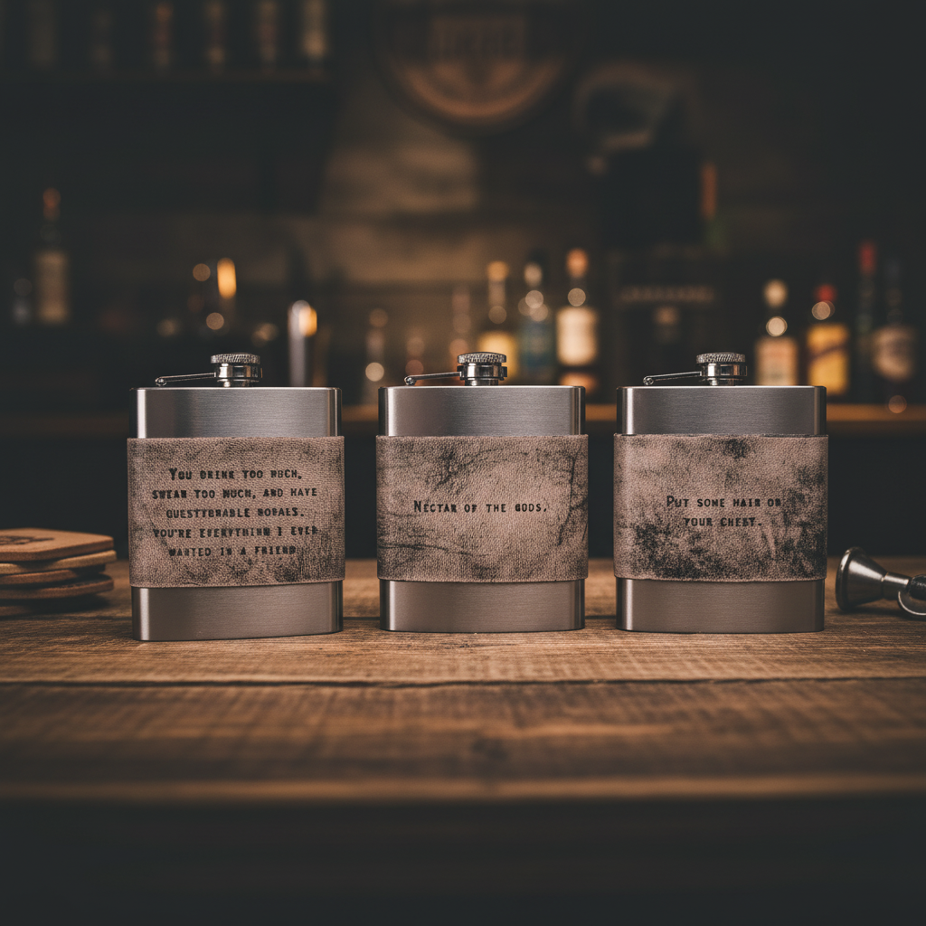 These leather flasks make for the perfect gift. Each flask is made of stainless steel with a leather wrap embossed with a quote.