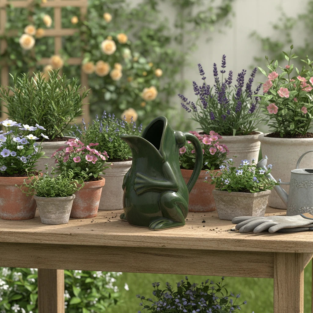 Hop into whimsy with this charming stoneware frog pitcher! Each piece features a reactive glaze that creates one-of-a-kind color variations in rich greens, making your pitcher truly unique. Perfect for serving beverages at garden gatherings, displaying as a delightful conversation starter on your shelf or use it as the most adorable watering can for your plants! The playful amphibian design brings personality to any room, while the durable stoneware construction ensures lasting enjoyment. Since no two are alike, you're getting a special treasure that celebrates the beauty of handcrafted imperfection.