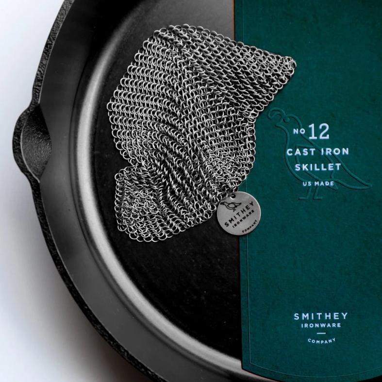 The cleaning tool you never knew you needed, our chainmail scrubber removes stubborn burned-on bits of food while maintaining your seasoning with a light swirl over your Smithey’s surface.  Designed for use both on cast iron and carbon steel cookware.