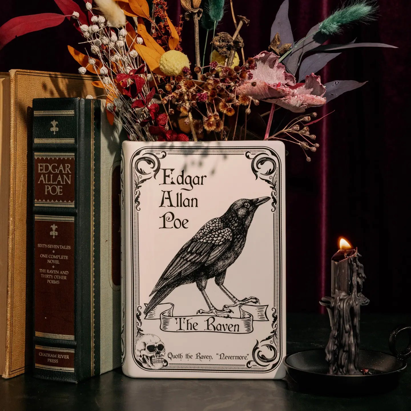 Take your love for classic novels one step further with our ceramic decorative books. Featuring artwork influenced by Edgar Allen Poe's beloved story The Raven and a multifunctional design, this unique ceramic vase is sure to dress up any room. Fill this large ceramic vase with fresh flowers or your favorite writing utensils to adorn your space with the most practical and gothic bookish charm.