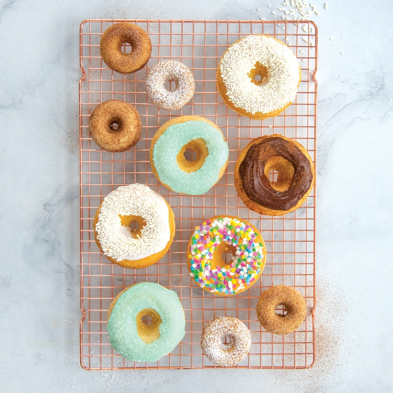 A delicious, homemade version of your favorite bakery treat no frying necessary! Our Mini Donut Pan makes 12 baked mini donuts with a beautiful Twilight Blue exterior paired with a premium nonstick silver interior for easy release and cleaning. Fun mini party dessert idea for any occasion such as birthdays, weddings, and showers.