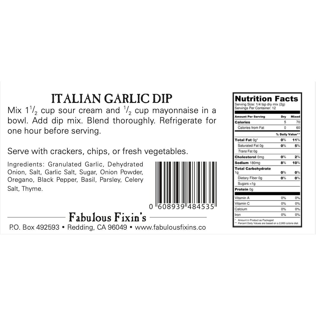 A dip with an Italian flair. Lot’s of garlic and herbs. Delicious dip for veggies, crackers, or chips. One of our best sellers!