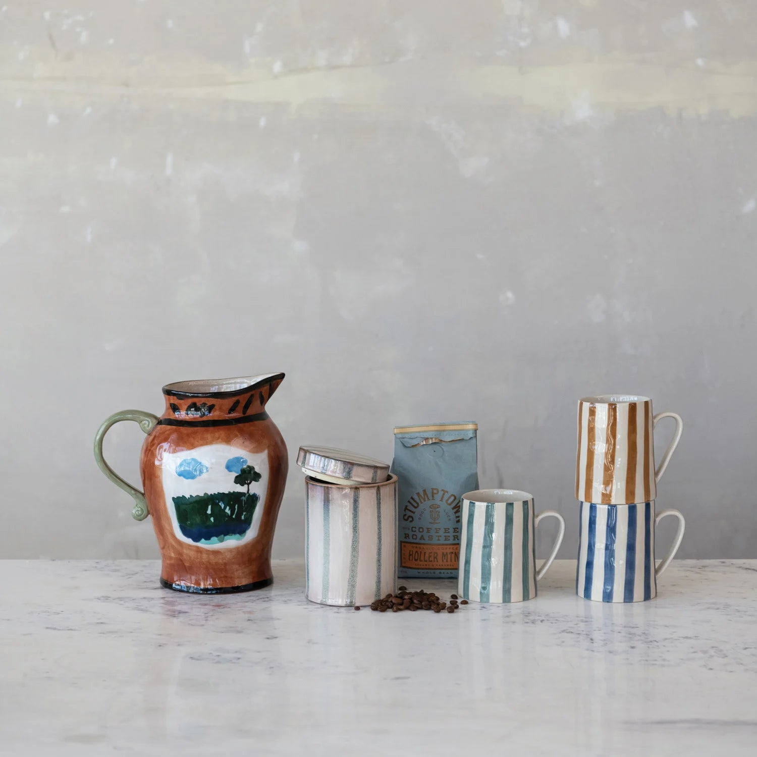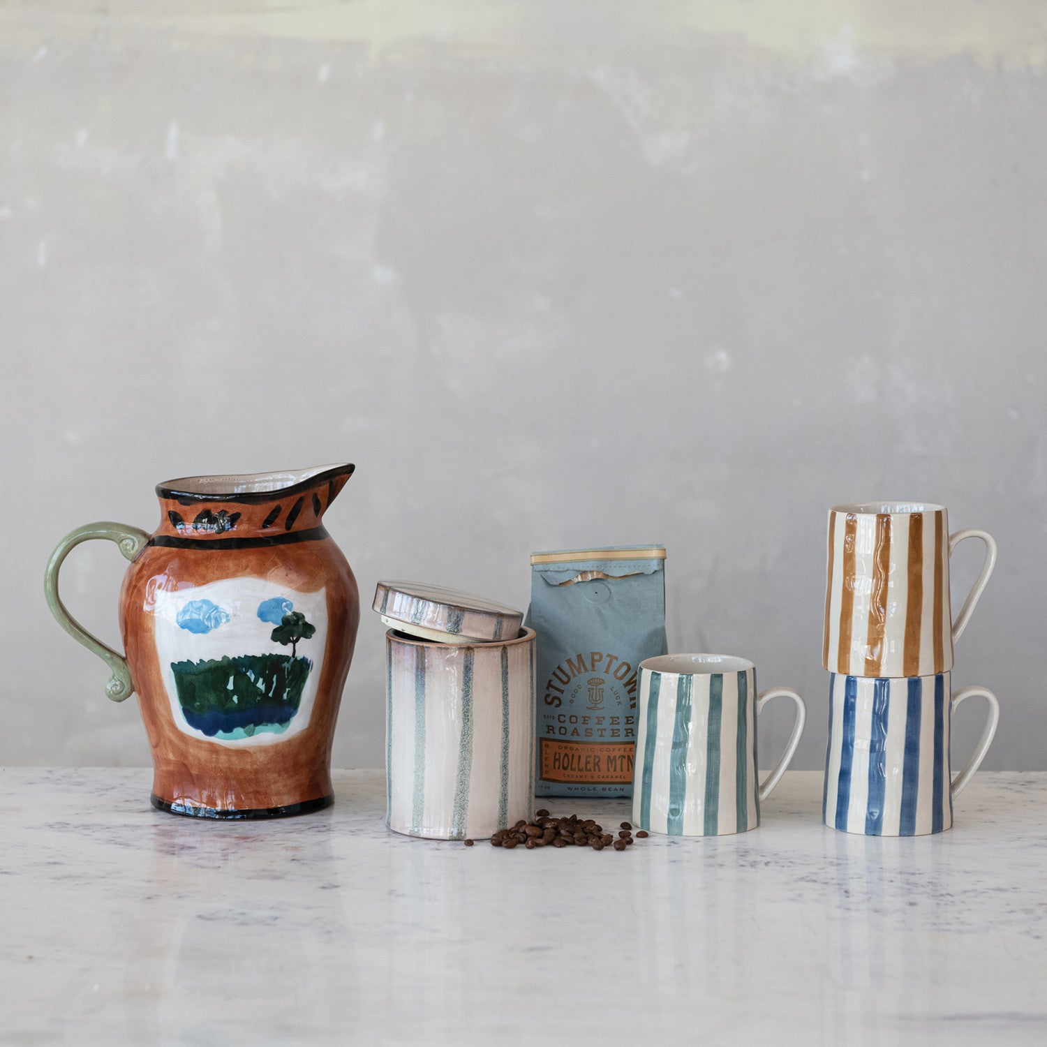 Hand-Painted Stoneware Striped Jar w/ Lid. Reactive Glaze. Blue & Cream Color