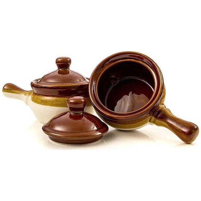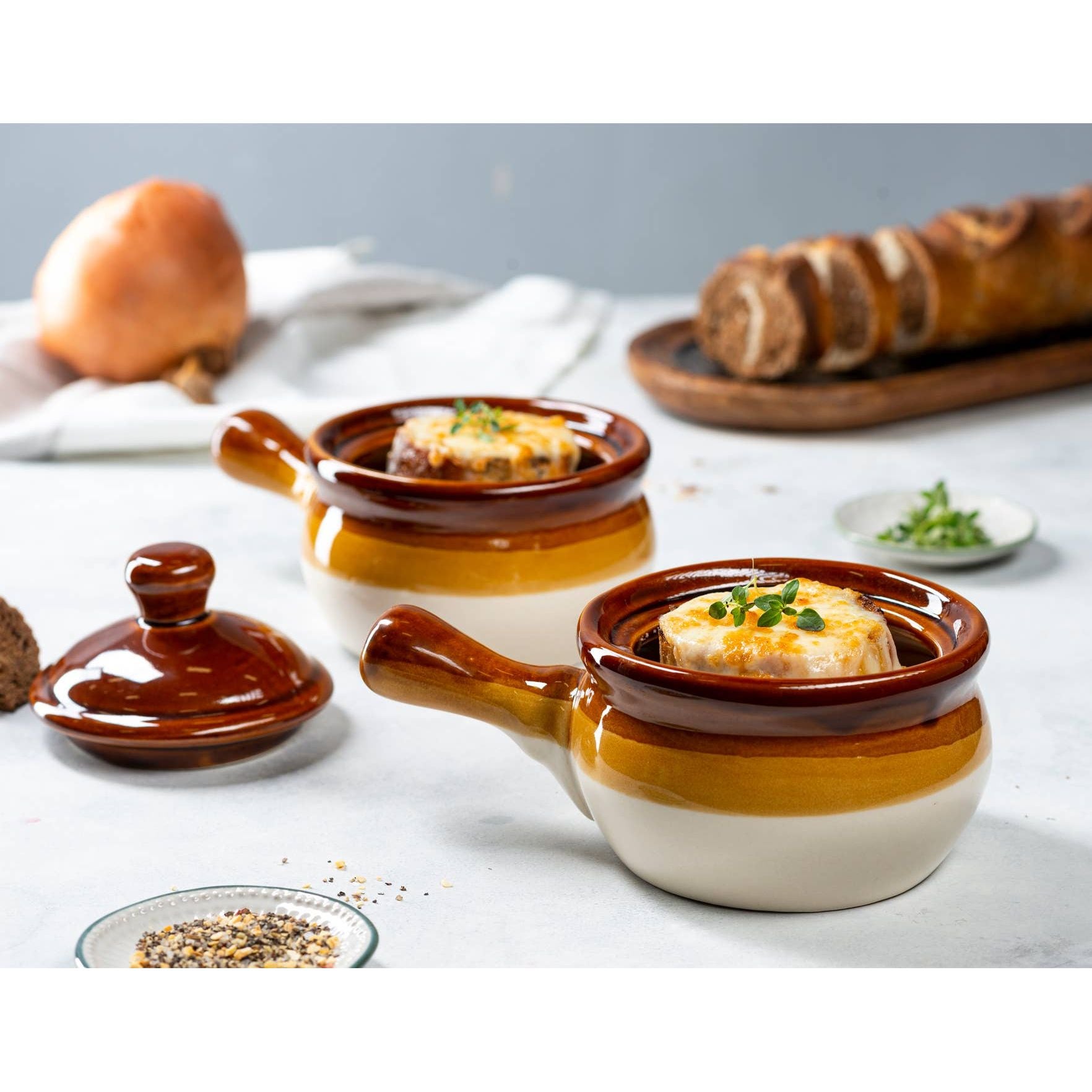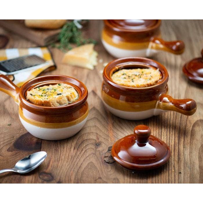 These durable ceramic crocks are designed with a large stay-cool handle for breezy oven-to-table transfer. Each bowl is paired with a charming lid to keep contents warm until served. Perfect for everything from individual pot-pies and casseroles to our personal favorite; gooey, cheesy French Onion.