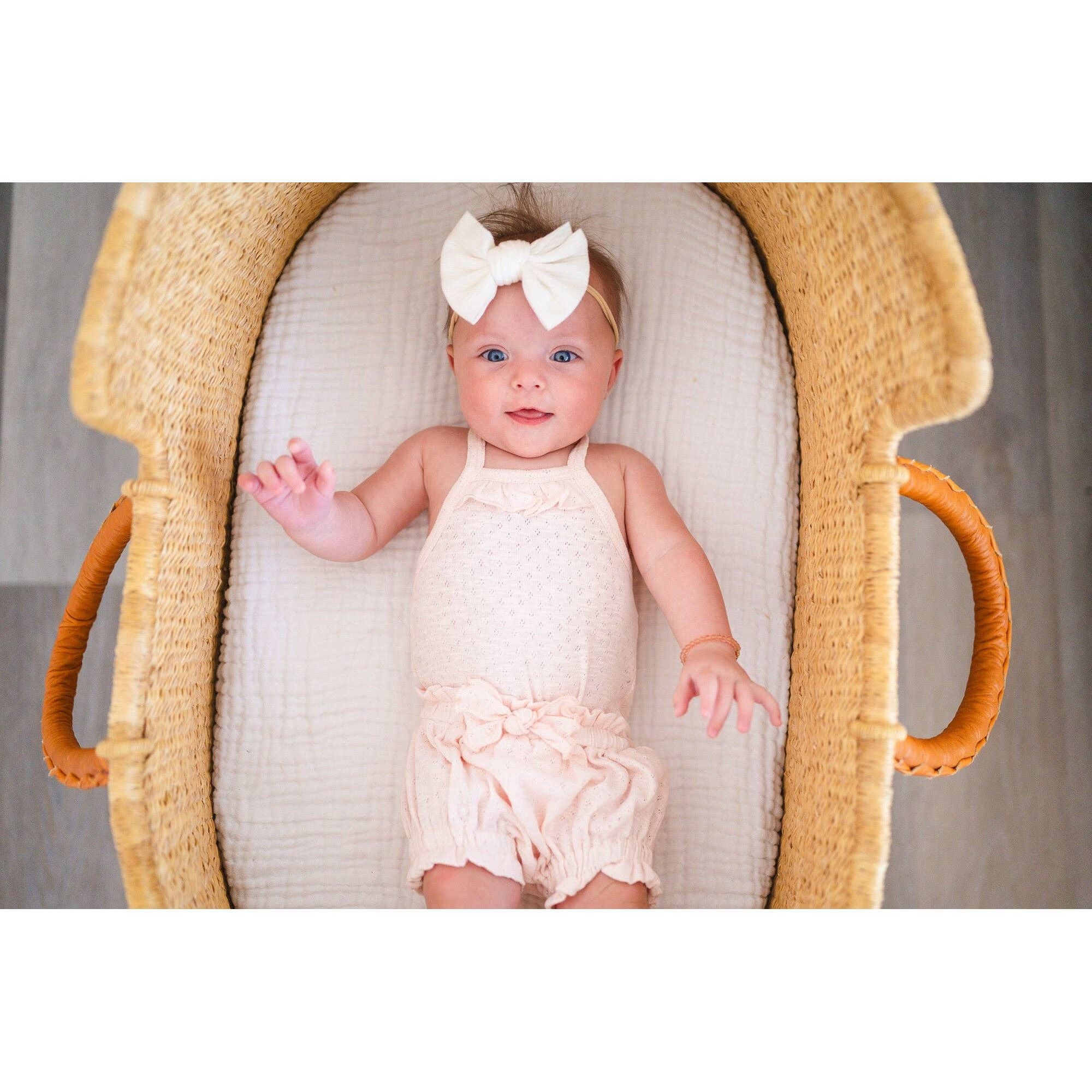 * GOTS certified 100% organic cotton * buttery-soft heathered pointelle fabric with a delicate texture * soft elastic at the waist and around thighs for total comfort * ruffle detail at thighs for added cuteness * pairs perfectly with our ruffle and smocked bodysuit * tagless for added comfort against baby's skin * azo-free, non-toxic, eco-friendly dyes * ethically made in India * machine wash/dry * cut a little long to account for some shrinkage in length that may occur in the dryer