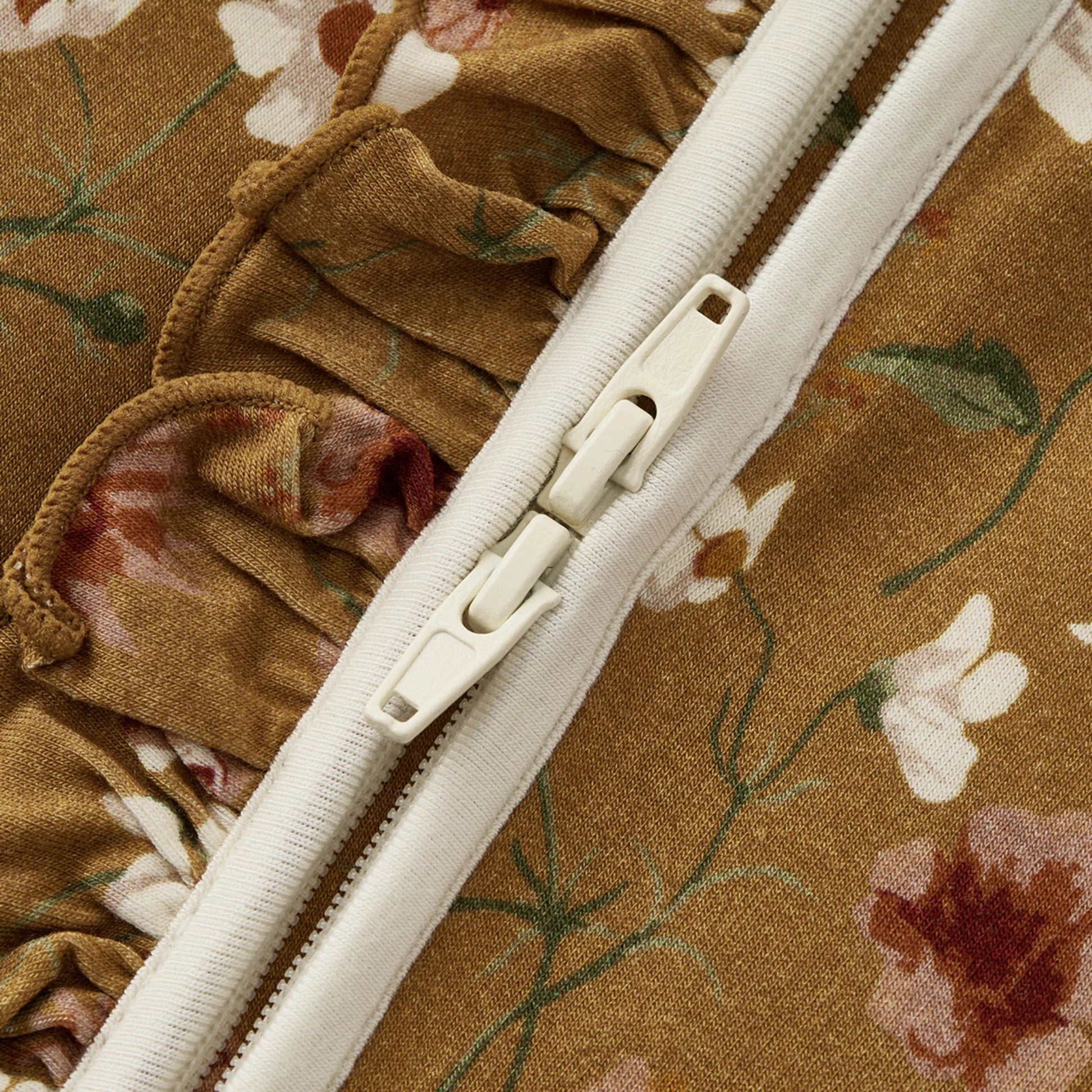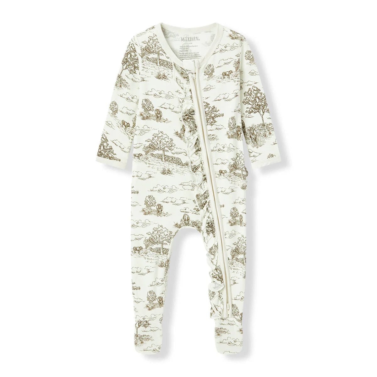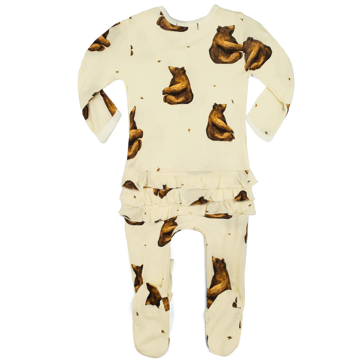 I zip, you zip, we all zip! Whether zipping from the top-down, bottom-up, or somewhere in between, we made changing and dressing just a wee bit easier with our baby Luxe Stretch Ruffle Zipper Footed Romper. A subtle, ruffle-edged asymmetrical seam and three cascading, full-width rear ruffles add a little extra fun. With dual, two-way zippers and a closed-foot detail, this timeless classic blends design with functionality while wrapping your little ones in gentle comfort. Three adorable prints available: Wildflower Apple Orchard, Country Toile and Honey Bear.