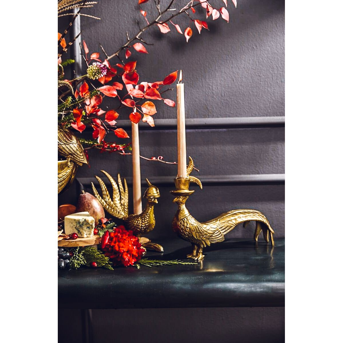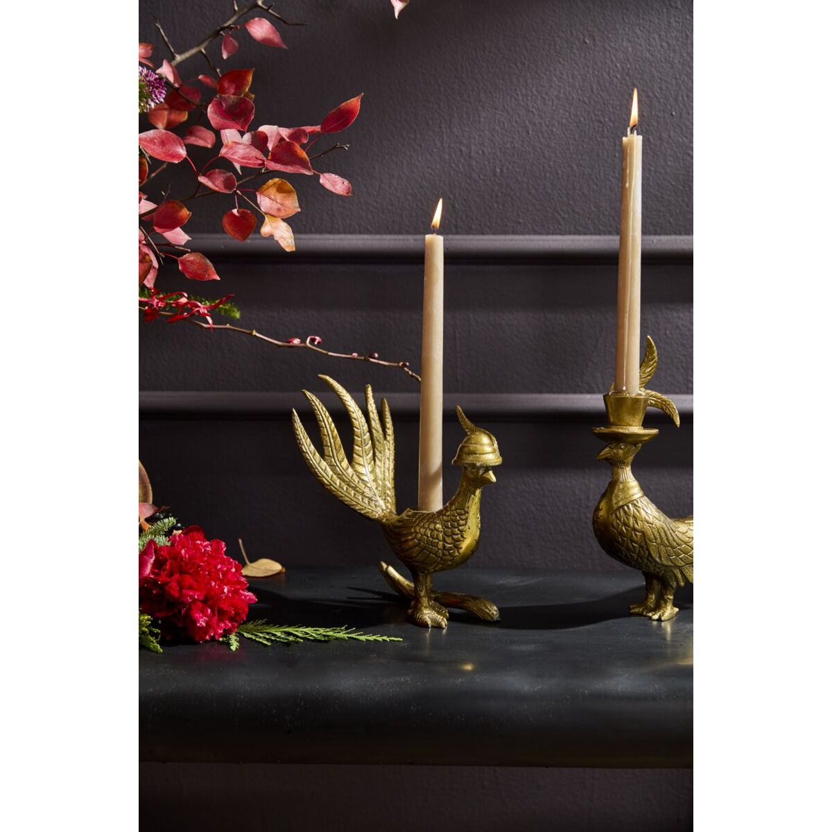 These two charming pheasants with full plumage and feathered hats are crafted from recycled cast aluminum with an antique gold finish. Each taper candlestick showcases a dimensional design with a candle opening in their hats. Pair them together to deck the halls, shelves, and tables with style. SOLD INDIVIDUALLY.
