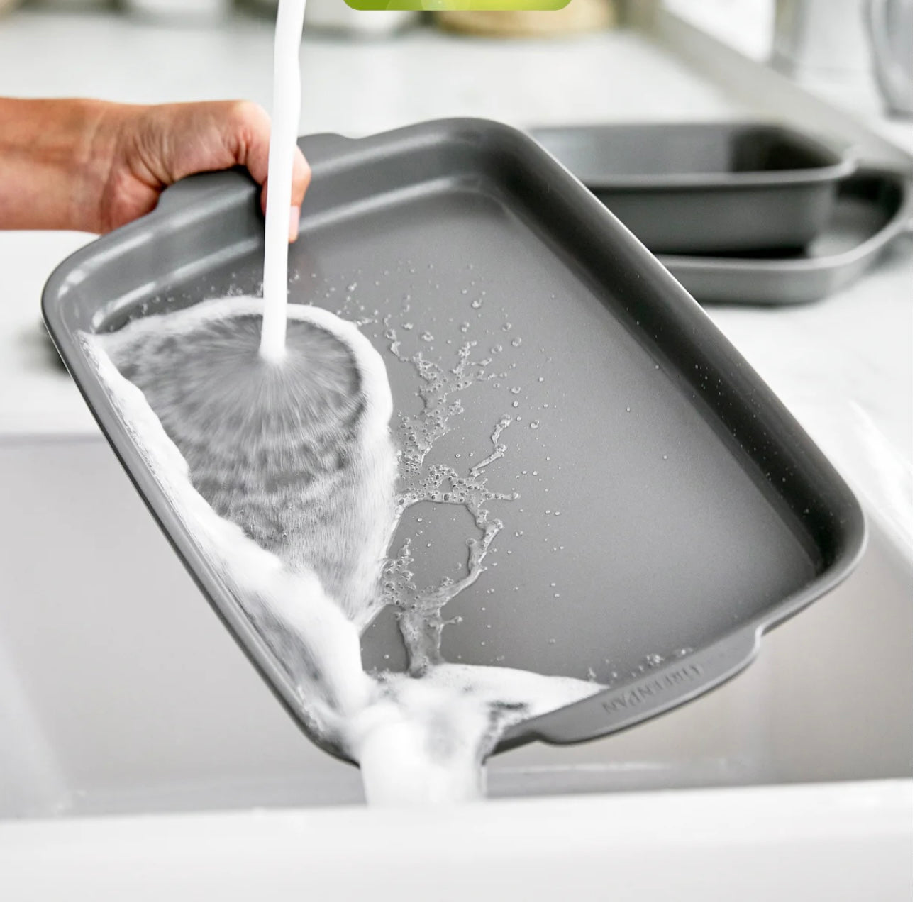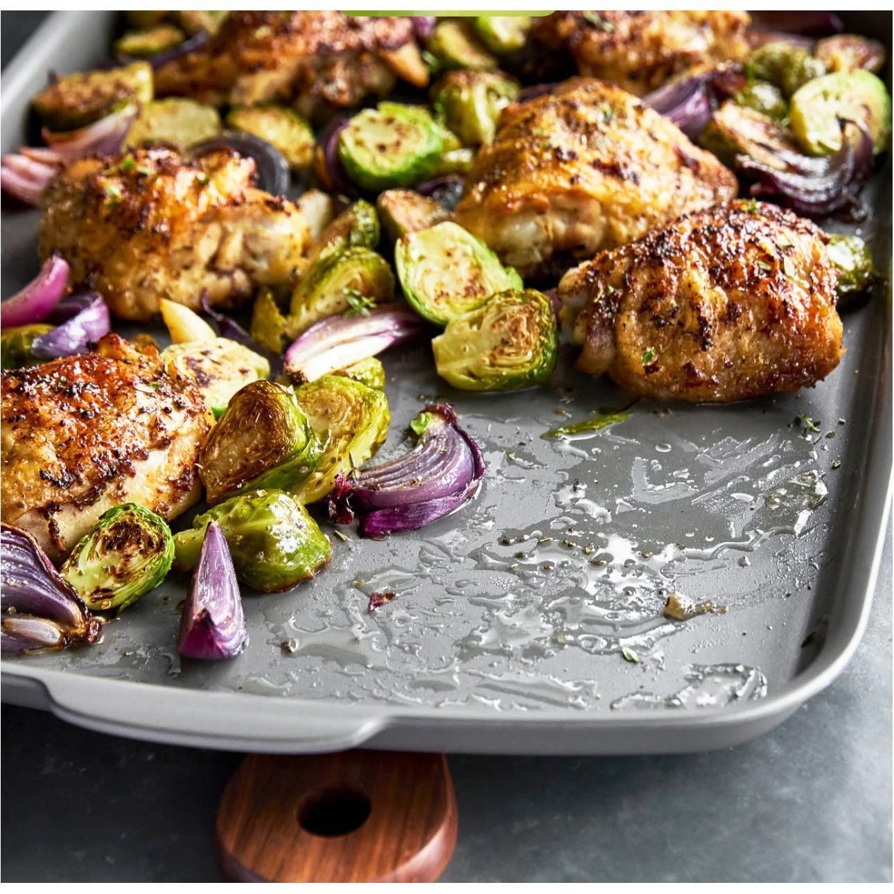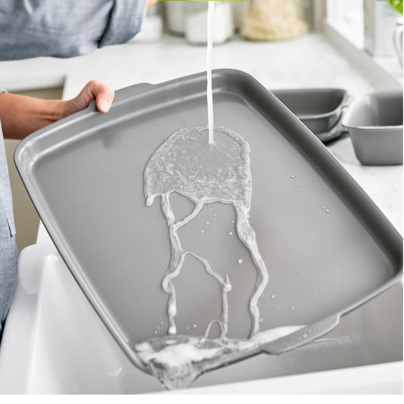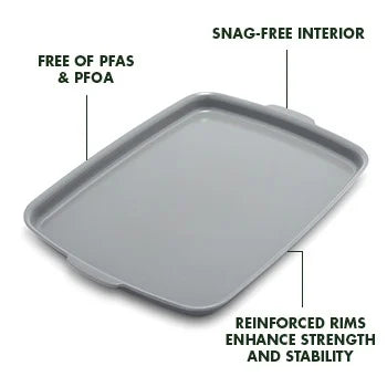 Crafted from ultra-tough cast aluminum, these pans are a MUST HAVE for every kitchen. Available in two sizes, the quarter sheet pan is the go-to for sides, veggies, and hundreds of other smaller things. The rolled edges make it extra sturdy and warp-resistant to prevent food from cooking unevenly. The half sheet pan - a true workhorse; this pan is one of the most versatile pieces of cookware you can own! The solid one-piece design eliminates food traps and the spacious surface makes it perfect for family meals.