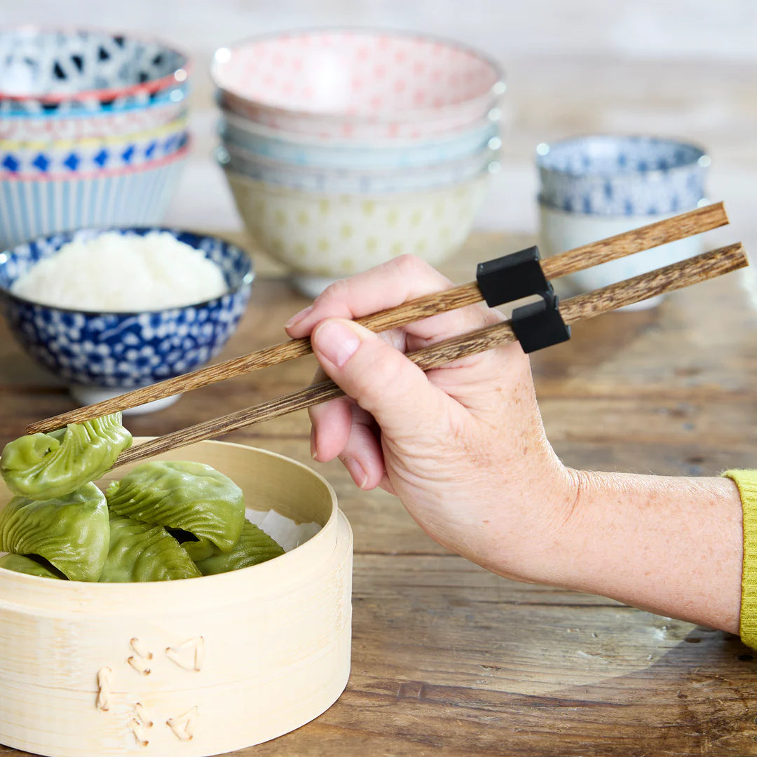 Flexible plastic hinge makes mastering chopsticks a snap. Suitable for both children and adults, right or left-handed use. Natural wood and plastic. Hand wash