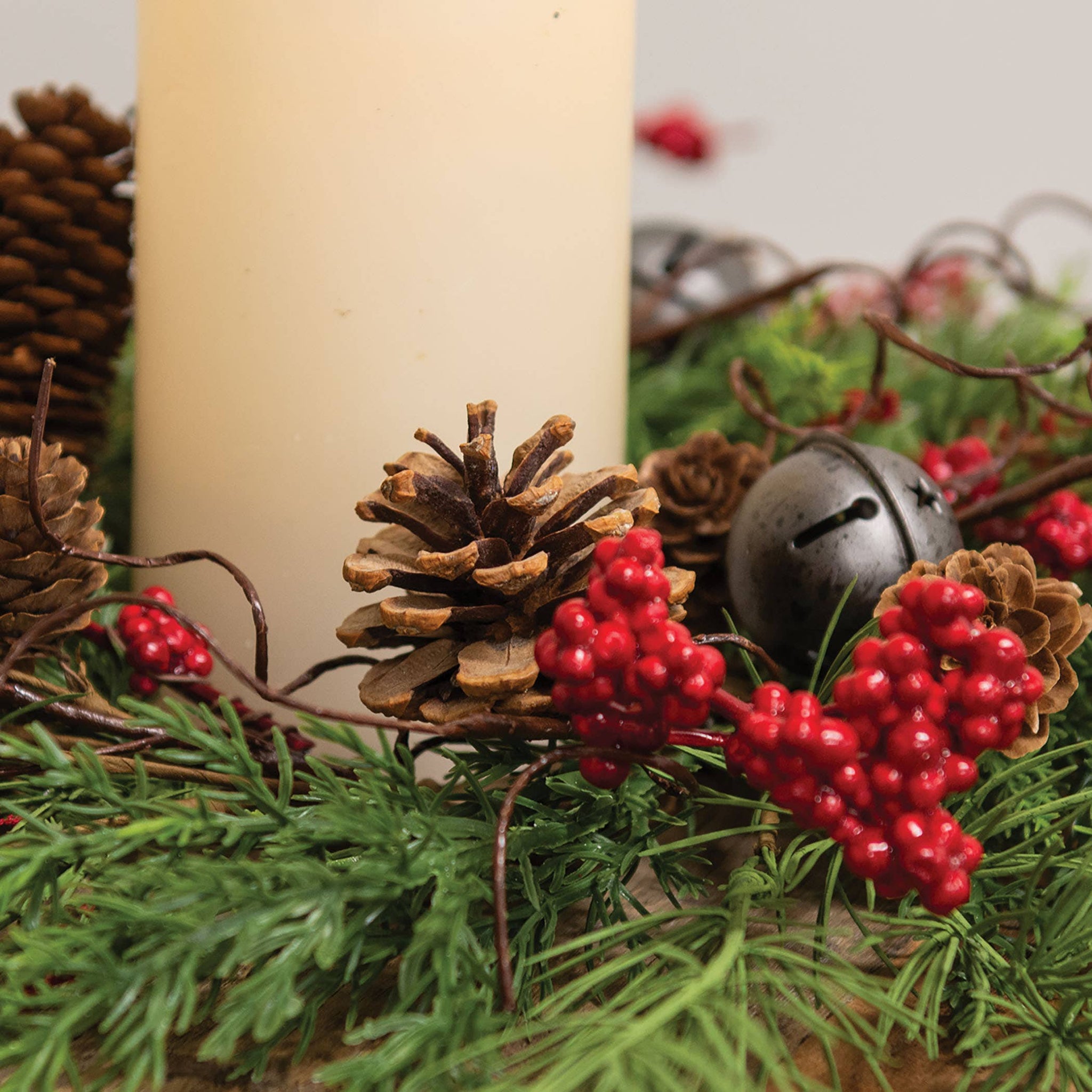 The Joyful Mixed Pine & Pepperberry Candle Ring brings festive, textured design to decorative seasonal displays. A flexible brown-wrapped ring serves as the base, sprouting brown and green branches. Green faux bristles in a range of styles adorn the branches for a dimensional look. Clusters of red berries, delicate red florals, and pinecones in various sizes complete the candle ring. A trio of rusted jingle bells with cutout star details add a festive finish. Measures 4.5” in inner diameter, 15” in outer diameter, and 2.5” deep.
