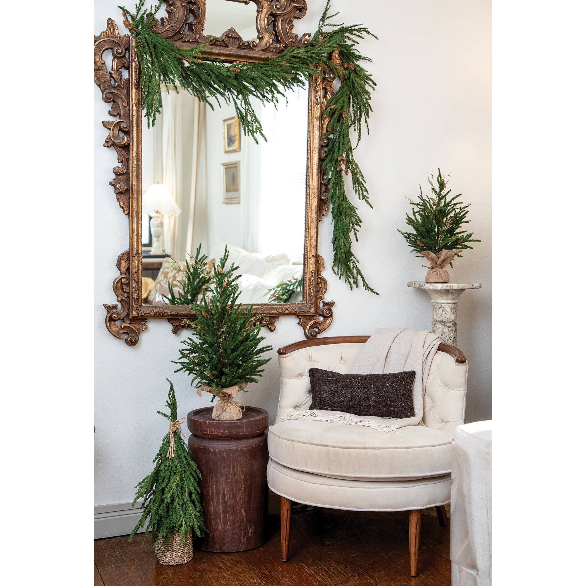 The Soft Touch Austrian Pine Tree in Burlap Base accents shelf or tabletop displays with nature inspired style. The brown stem sprouts green and brown branches and a voluminous arrangement of green pine needles. Curly brown twigs and dainty beige blooms accent the tree along with small pinecones. The freestanding base is wrapped in neutral burlap and tied with a jute twine bow. Measures 24” high by 4” in diameter.