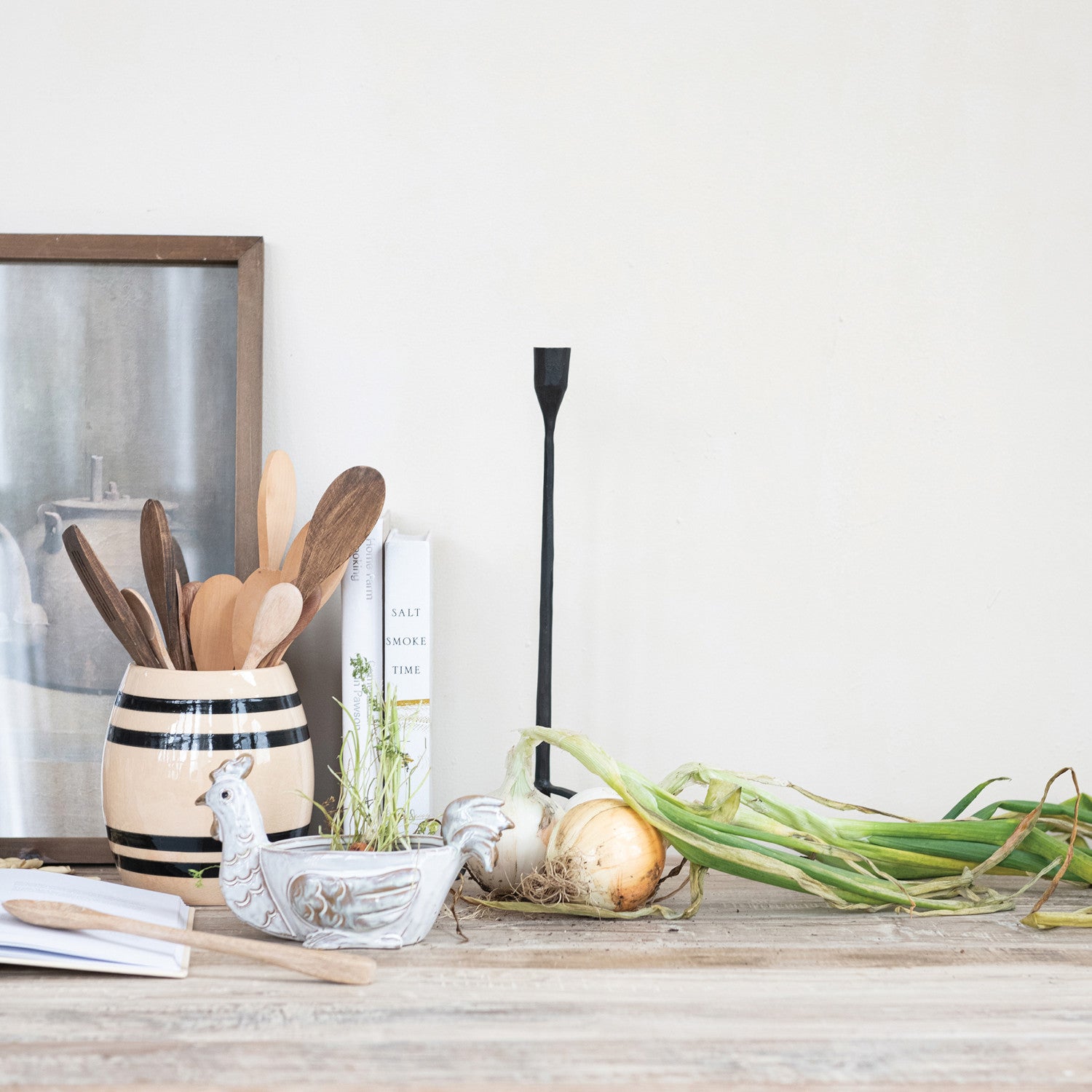 This vintage reproduction crock is made of stoneware with a striking crackle glaze and black and cream stripes. Due to the handmade nature of this unique item, each one will vary slightly in appearance. Perfect for adding a touch of classi , vintage  charm to your kitchen!