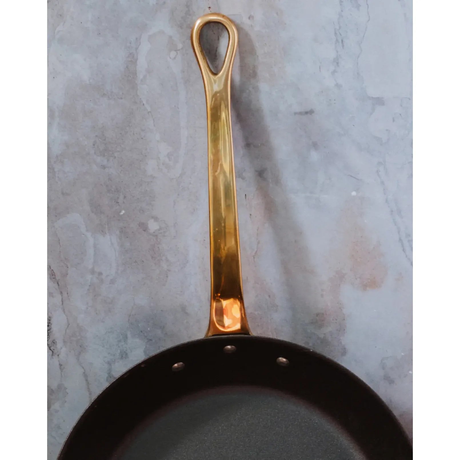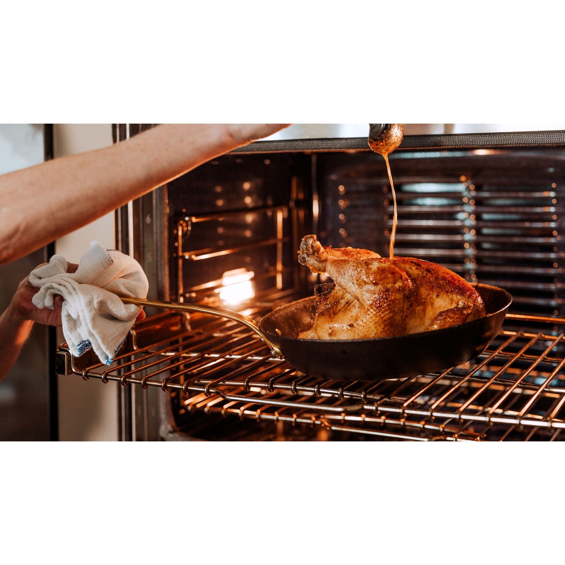 The pan clocks in at 2.5mm thick—compared to our standard 2.0mm—to add extra heft, quality, and durability. The 100% brass handle is long and easy to reach, even from the back of the oven. Brass develops its own unique patina and character over time, evolving alongside the Pan’s seasoning.