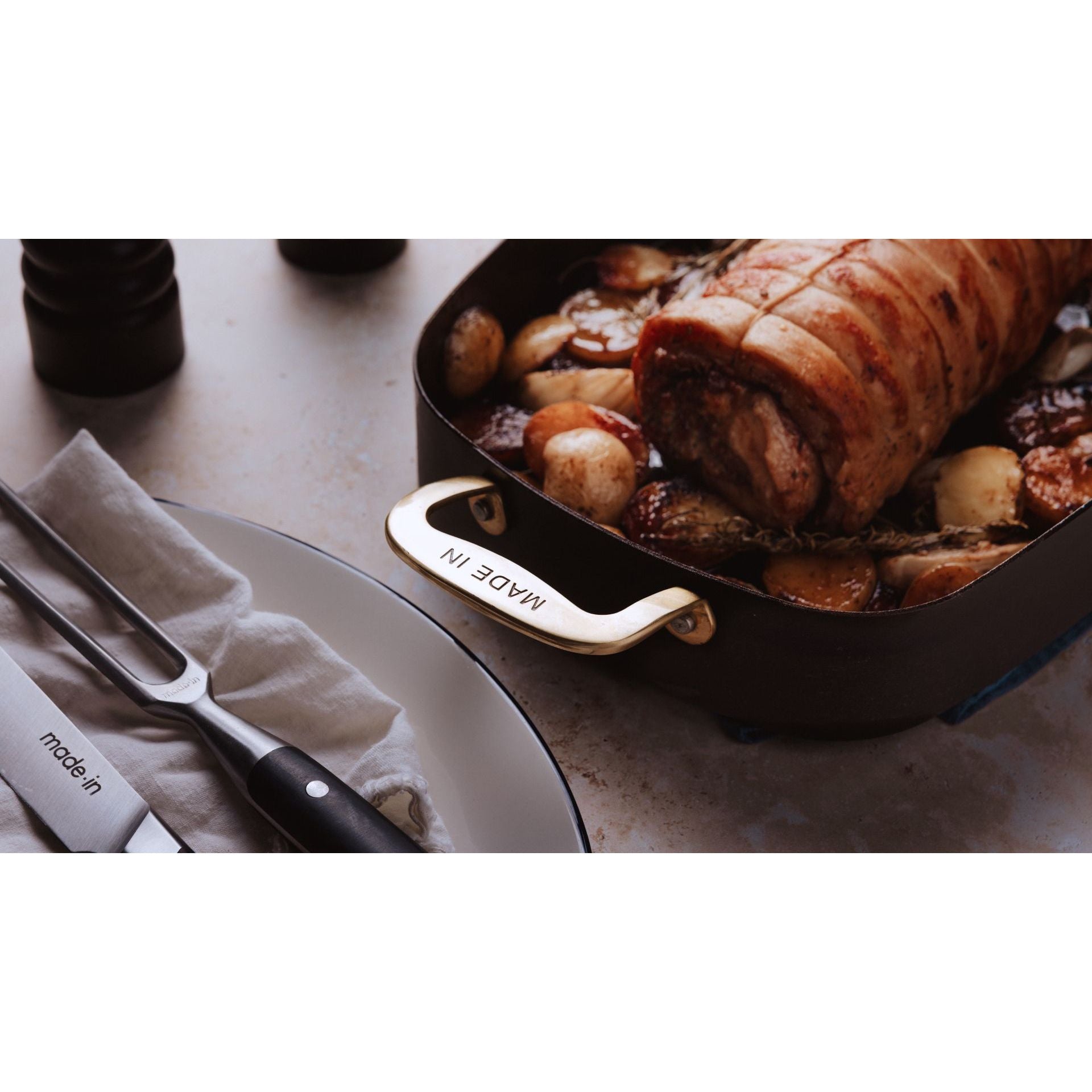 Chef's love of Carbon Steel and our mastery of this material come together for an unexpectedly practical execution of a classic shape. It combines the heat retention of cast iron with the control and maneuverability of Stainless Clad, resulting in a natural non stick alternative that can seamlessly transition from stovetop searing to oven roasting. Its rounded edges and straight, high sides ensure your roasts are tender, juicy, and always crispy. Size-wise, our Roasting Pan comfortably fits a 12-pound turkey, and is large enough for caramelizing to take place but compact enough to make stovetop pan sauces. Discover the difference this chef-perfected tool will make in your most cherished meals.